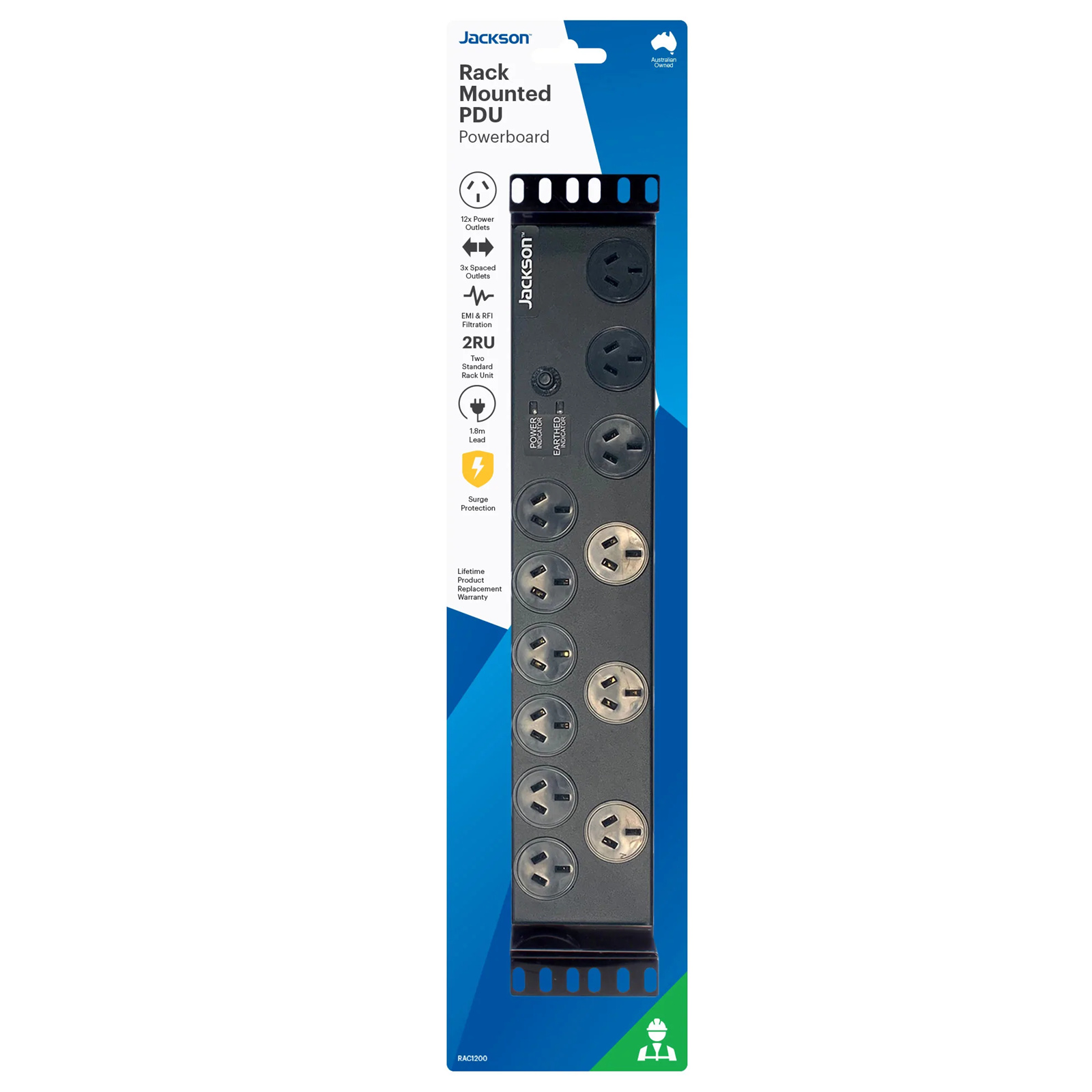 Jackson RAC1200 2RU 12 Outlet Horizontal Power Rail Surge Protected 525J AU/NZ