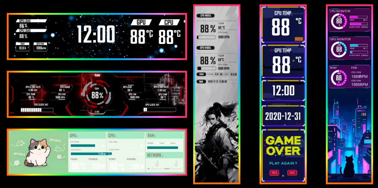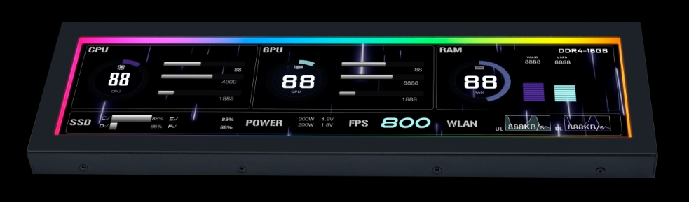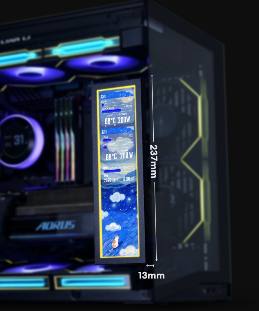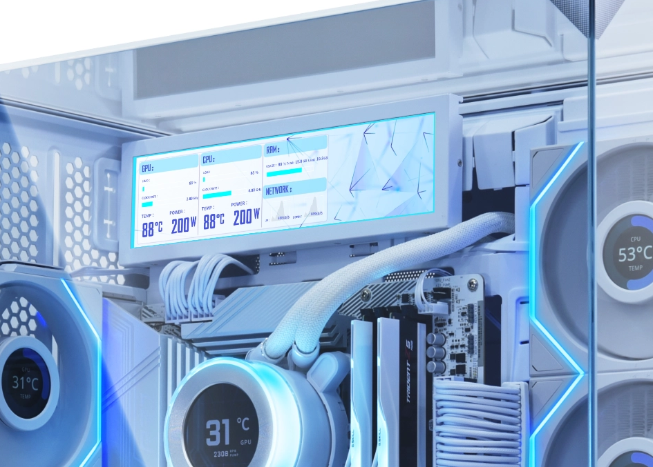 Designed with a wide range of templates and a modular layout system, this screen offers both personalized visuals and practical functionality. Users can choose and customize designs to display real-time CPU/GPU metrics, system temperatures, custom animations, and personal logos, turning any PC into a stylish, professional dashboard.