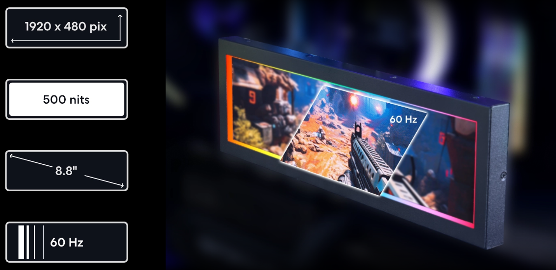 8.8″ IPS LCD, 1920×480, 60Hz, 500 nits
