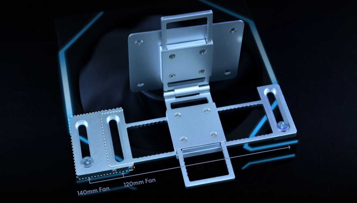- Multiple mounting options: 120/140mm fan mounts, adhesive, sliding rail with angle adjustment