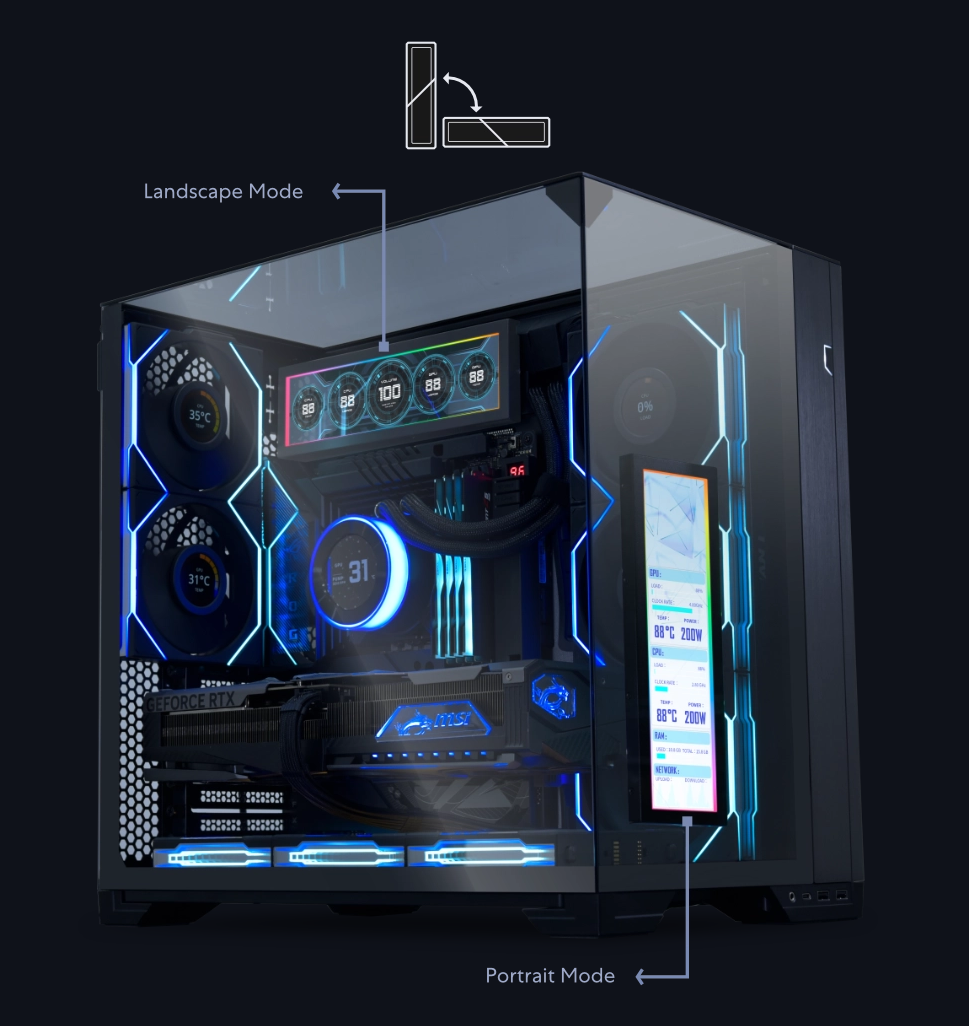 The 8.8″ Universal Screen connects via USB, either through a motherboard USB 9-pin header or a rear I/O Type-A port, allowing it to function as a fully independent display without using any of your graphics card's outputs. This plug-and-play setup offers a clean and flexible way to show hardware stats, custom media, or animated overlays, all without draining GPU resources, while freeing up GPU ports and ensuring greater flexibility in system configuration.