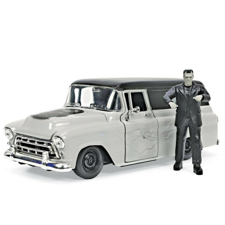 The model features opening doors, a detailed interior, and rolling wheels, making it not only a display-worthy piece but also interactive for collectors who appreciate hands-on engagement. Whether on a display shelf or as part of a larger themed collection, the Frankenstein 57 Chevy Suburban carries both showpiece and play value.