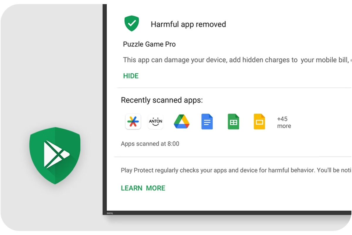 Google Play Protect prevents harmful apps from being downloaded to the SL04 and removes any that exhibit malicious behavior.