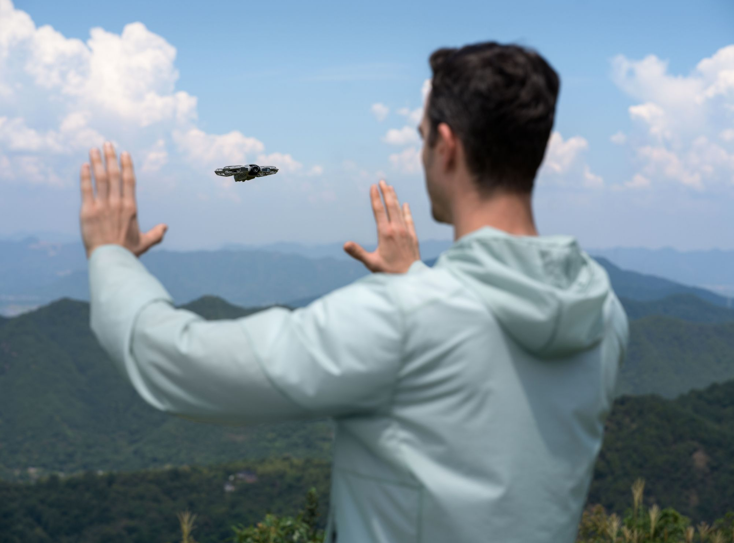 Easily adjust Neo 2's direction and proximity with one or both hands [3]. Point your palm toward the drone to guide it up, down, or side to side, or use both palms for precise control over proximity. No remote controller is needed for camera angle adjustment.