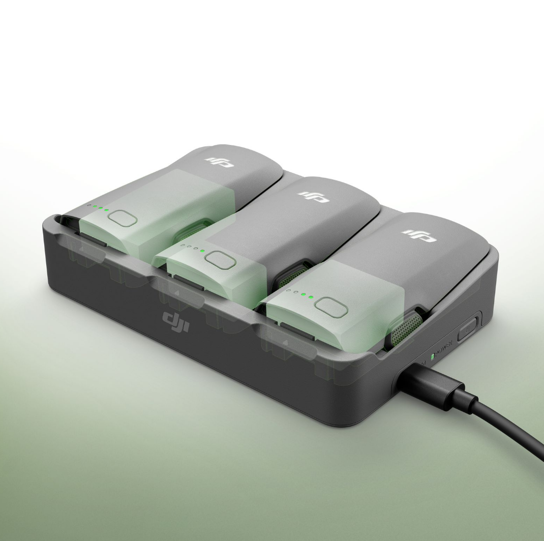 The number of batteries that can be charged simultaneously depends on the power of the charger used. Using a charger rated above 45 W allows you to charge three batteries at the same time. Using a charger rated between 30 W and 45 W allows you to charge only two batteries simultaneously. Using a charger below 30 W will charge the batteries sequentially, from the highest remaining charge to the lowest. Refer to the charging protocols supported by the charger.