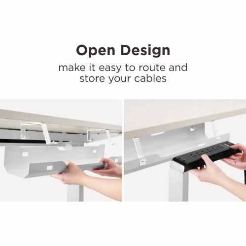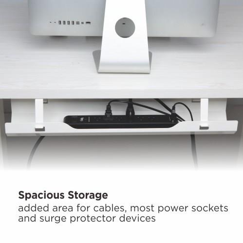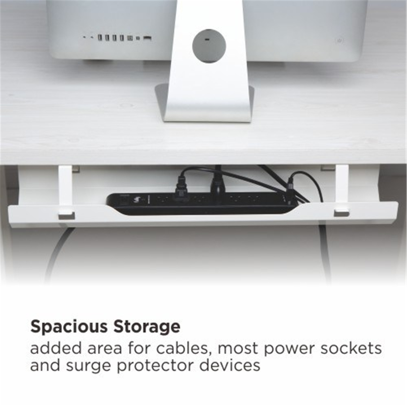 Maintain a neat and clean appearance underneath your standing desk. This Under-Desk Cable Management Tray provides plenty of storage space for cables, power strips and more. Made of powder-coated steel, this tray is sturdy and durable. Open design makes it easy to route and store cables. With included mounting hardware and easy to follow instructions, the installation is as easy as 1-2-3. Create an eye-pleasing and comfortable workplace with KONIC Under-Desk Cable Management Tray