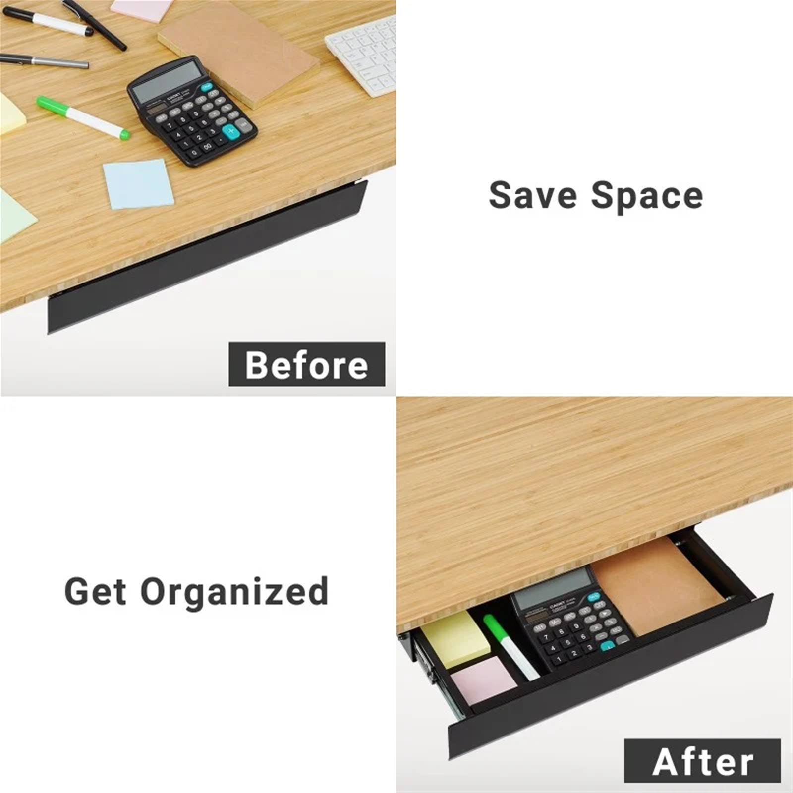 Make your workspace clean and tidy to improve work efficiency and eliminate stress. The Slim Under Desk Drawer easily adds storage space to your standing desk. It doesn't take up space on the desk surface as it fits at the bottom of the desktop. It can hold your office accessories and stow personal items like keys, pens, and notebooks.