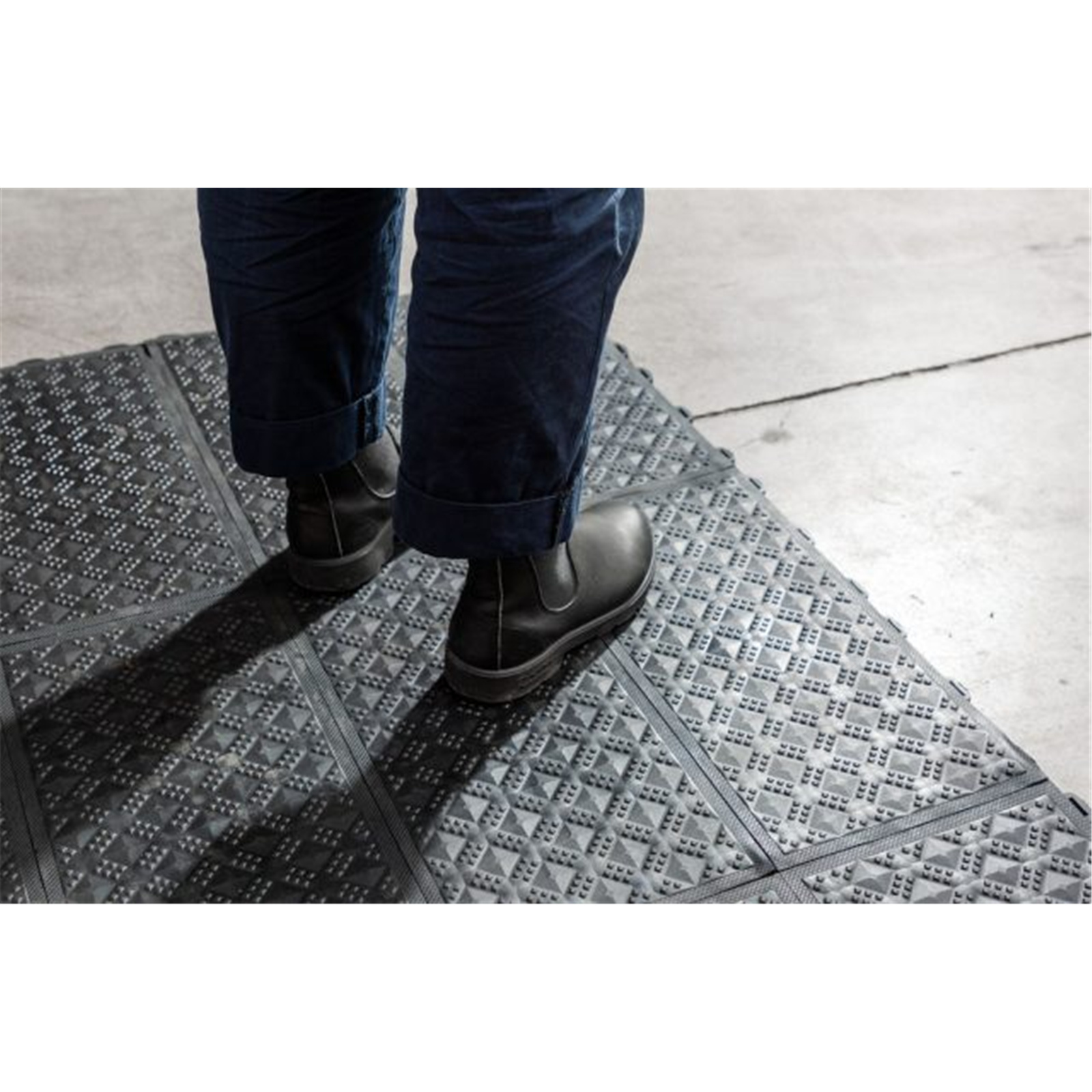 A floor Mat with compression tubes for Leg Comfort. Ergomat flooring tiles utilise a unique Compression Column construction specifically engineered to encourage proper body alignment, while promoting a calculated degree of movement or 'sway'. This almost imperceptible motion stimulates the muscles and promotes the efficient circulation of blood through the veins - especially in the legs - which is key to preventing worker fatigue and discomfort.