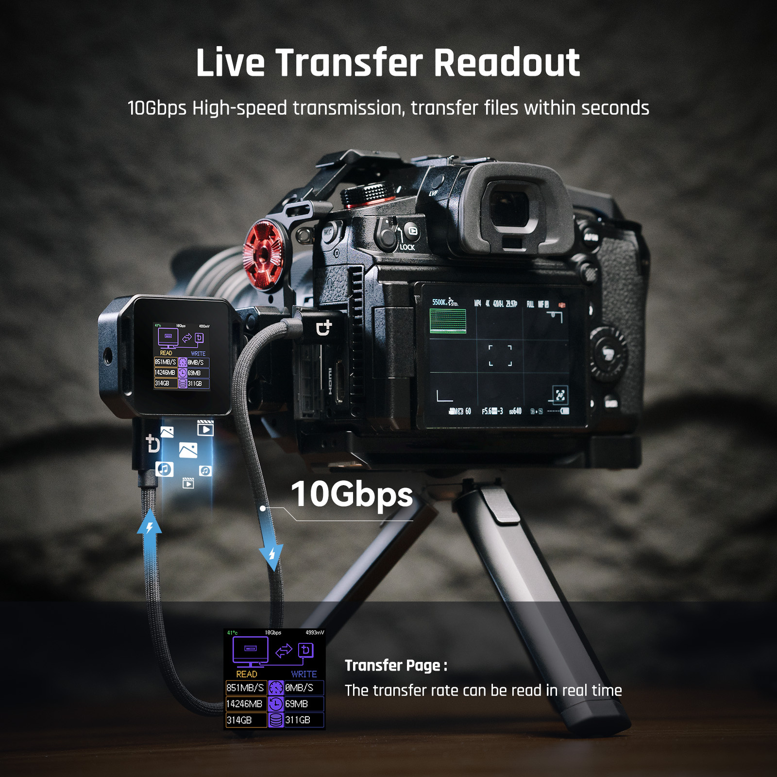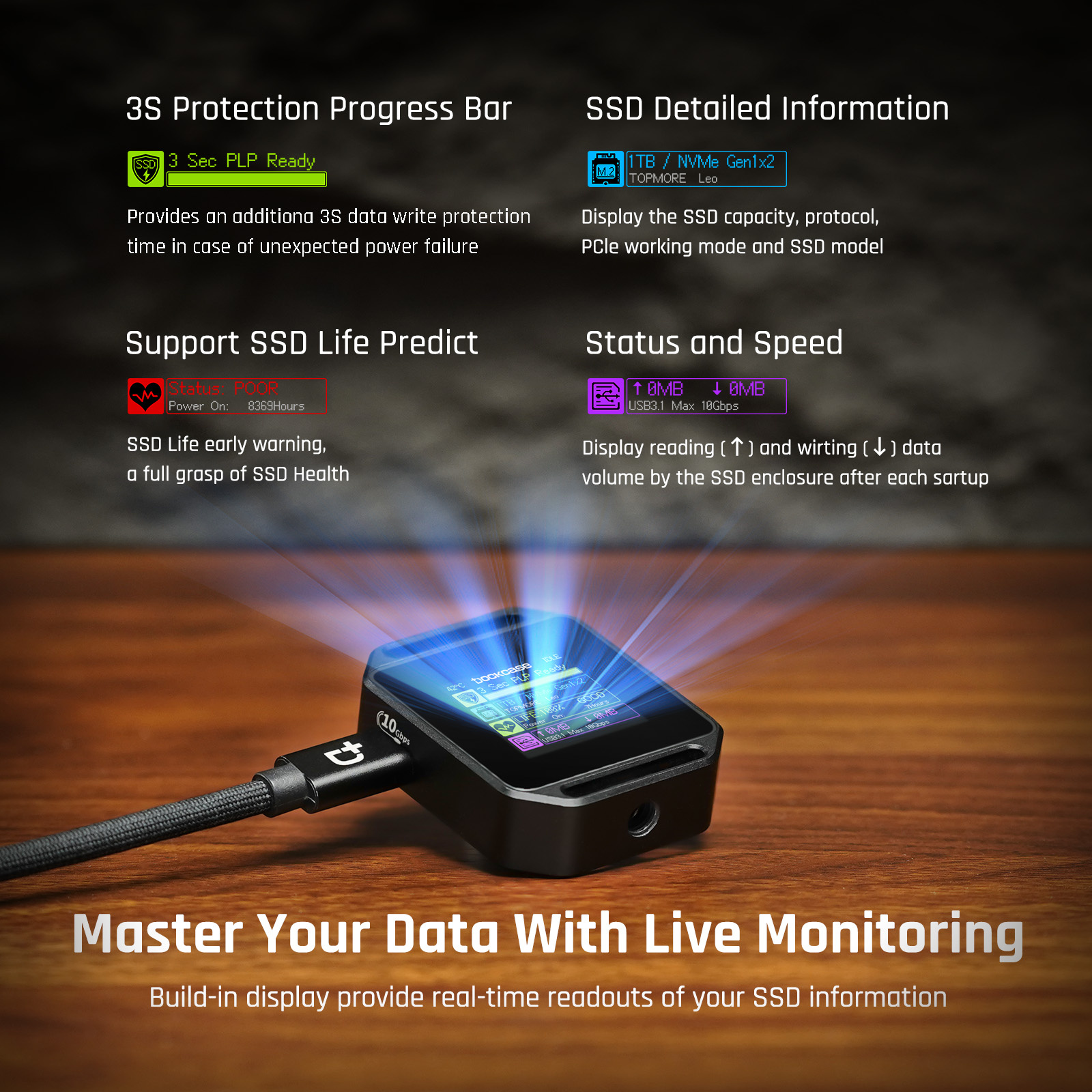Built-in display provides real-time readouts of your data transfer speeds, storage capacity and SSD temperature, etc. Stay in control of your data and effortlessly streamline your workflow with D-Key.