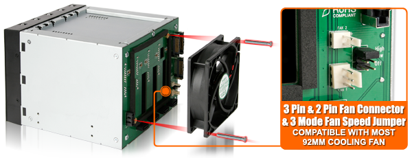 The FatCage MB155SP-B features a 3 mode fan speed jumper which can be changed at will to control the fan speed easily. The 3 modes include: High, Low and Off with respective speeds of 100%, 60% and 0% relative to maximum output. The settings can be simply changed by removing the jumper and relocating into the desired setting.