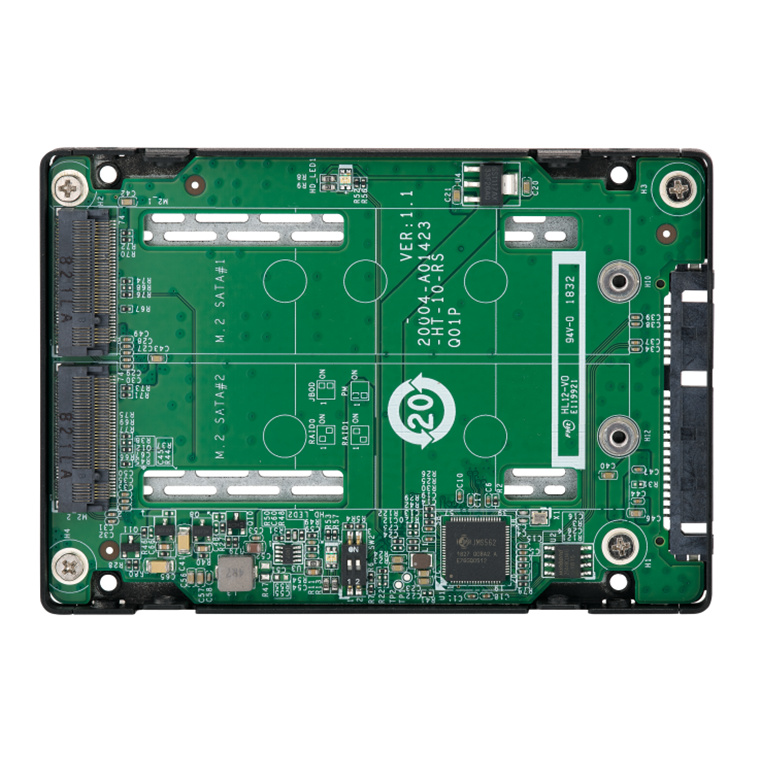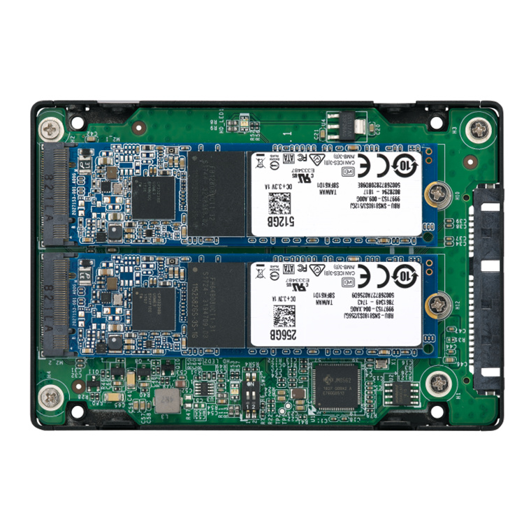 Use two M.2 SATA SSDs in a single 2.5-inch SATA drive bay with RAID support for PC and NAS