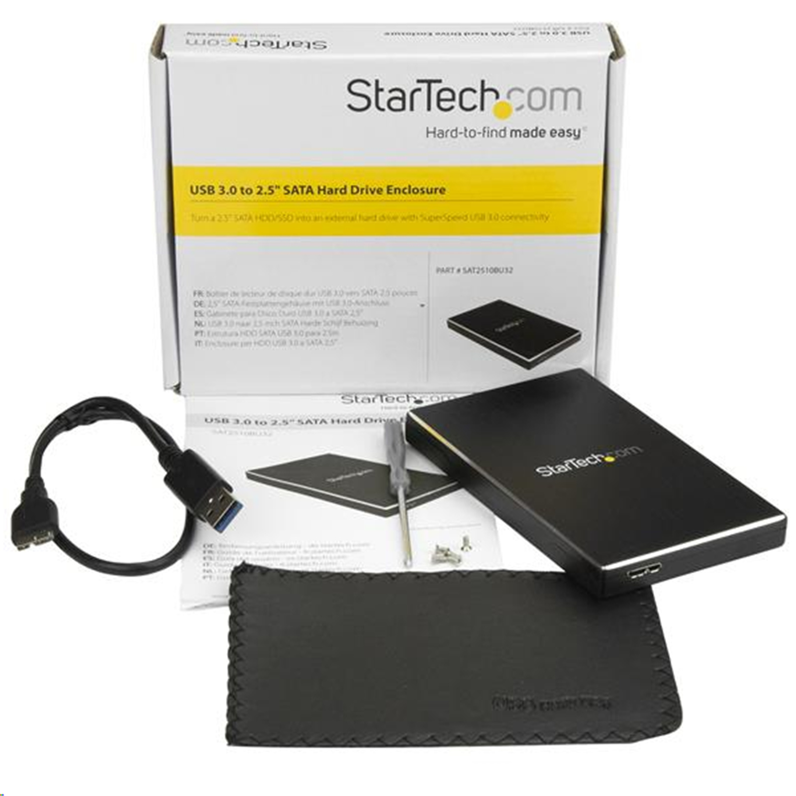 The SAT2510BU32 2.5-inch SuperSpeed USB 3.0 SATA Hard Drive Enclosure turns a normal 2.5-inch SATA hard drive (HDD) or solid state drive (SSD) into a portable, external hard drive. Connecting to a host computer through USB 3.0 with no external power required, this enclosure supports full SuperSpeed USB data transfer speeds up to 5 Gbps - 10x faster than the USB 2.0 standard, and is backward compatible with older USB connections (USB 2.0). Large capacity drives (tested with up to 1TB) can be used to greatly enhance your computer's storage/backup capabilities. Featuring a lightweight, portable design this USB 3.0 SATA HDD enclosure is constructed of aluminum, which offers maximum durability and operating heat dissipation. Backed by a StarTech.com 2-year warranty and free lifetime technical support.