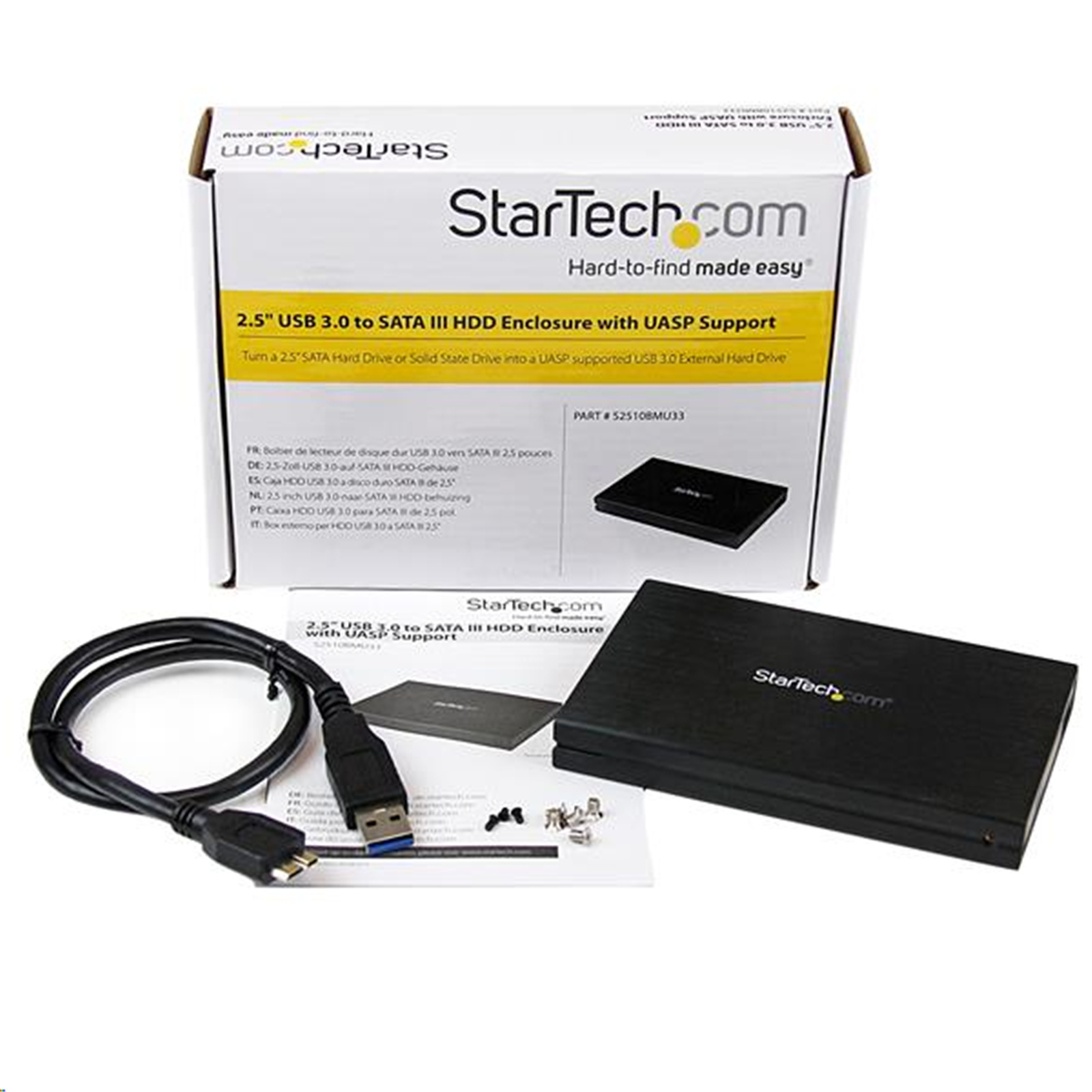 The S2510BMU33 USB 3.0 Hard Drive Enclosure with UASP lets you connect a 2.5in SATA III hard drive (HDD) or solid state drive (SSD) through an available USB port. The enclosure delivers optimal performance with a USB 3.0 connection, but is backward compatible with USB 2.0/1.1 host connections as well. Enhanced with UASP (USB Attached SCSI Protocol), this 2.5" SATA III enclosure performs up to 70% faster than conventional USB 3.0 when paired with a UASP-enabled host controller. Using a more efficient protocol than the traditional USB BOT (Bulk-Only Transport), UASP reduces latency, significantly increasing transfer speeds and reducing processor usage to utilize the full potential of your SATA III hard drives. See our UASP testing results below for further details. With support for SATA I/II/III, and large capacity drives (tested up to 1TB) this HDD enclosure is compatible with virtually any 2.5in SATA hard drive, and greatly increase the storage/backup capabilities of your computer. The USB 3.0/SATA III enclosure requires no external power adapter and features high quality aluminum construction, ensuring both portability and durability when carried as a laptop accessory. To ensure compatibility with your computer system, the S2510BMU33 supports all of the leading operating systems, including: Microsoft Windows® (8/7/Vista/XP/Server 2008/Server 2003), Apple® OSX (10.9/10.8/10.7/10.6), Linux, and Google Chrome OS™. Backed by a StarTech.com 2-year warranty and free lifetime technical support.