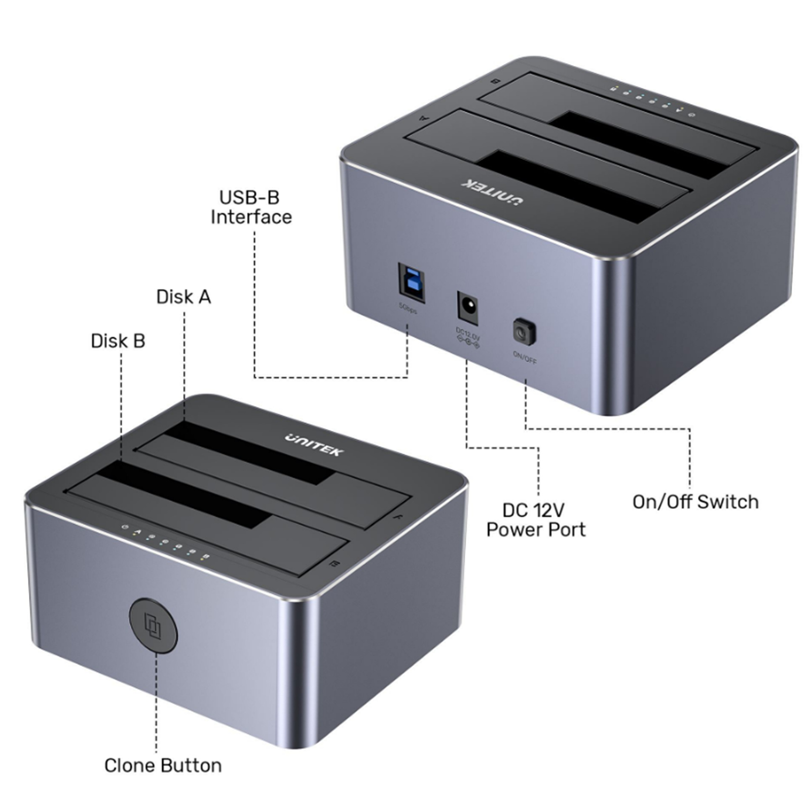 UNITEK USB3.0 to Dual SATA HDD Aluminium Docking Station with Offline clone function. Compatible with all 2.5''/3.5'' SATA HDD/SSD with any capacity. Supports SATA III, SATA II & SATA I. Plug & Play.