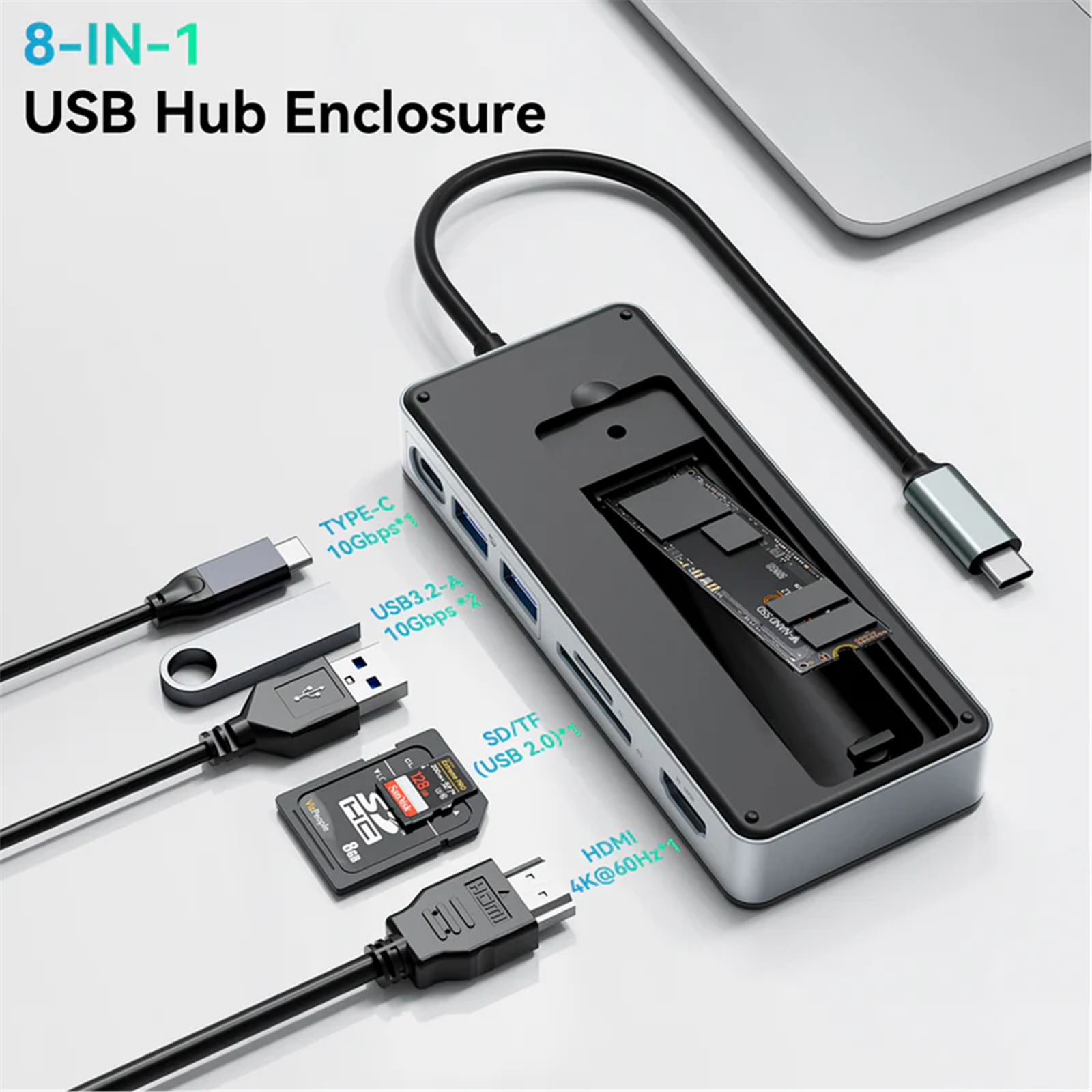 Yottamaster 8-in-1 USB-C with M.2 NVMe/SATA SSD Enclosure Hub USB 3.2 Gen 2 - 2x USB-A HDMI - SD/TF - Type-C PD100W- M2 Dual Protocol NVMe Slot