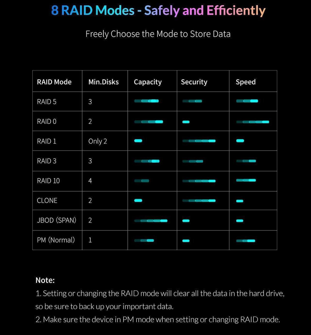Supports RAID 0/1/3/5/10/Span/Clone/Normal RAID modes, and you can configure multiple RAID modes according to your specific needs with just a tap of the easy-access switch. Or you can download SoftRAID Manager to create, manage and monitor the RAID modes you set up.
