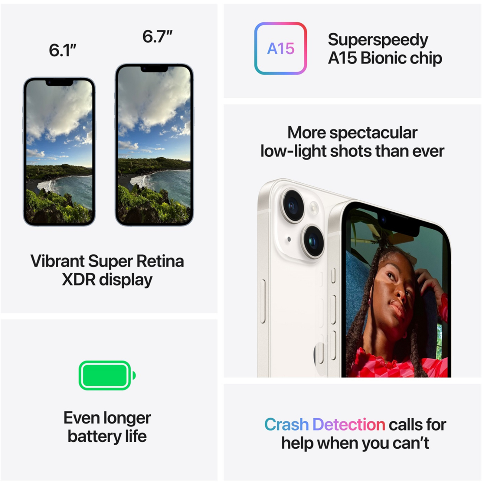 *The iPhone 14 display has rounded corners that follow a beautiful curved design, and these corners are within a standard rectangle. When measured as a standard rectangular shape, the screen is 6.06 inches diagonally (actual viewable area is less).