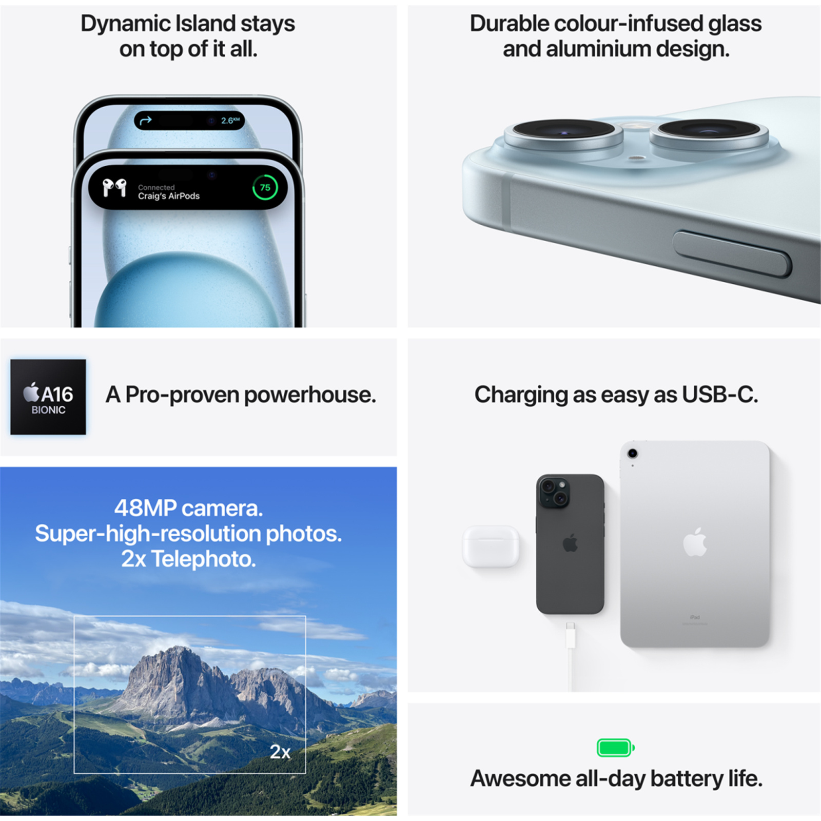For more information: https://www.apple.com/nz/iphone-15/specs/