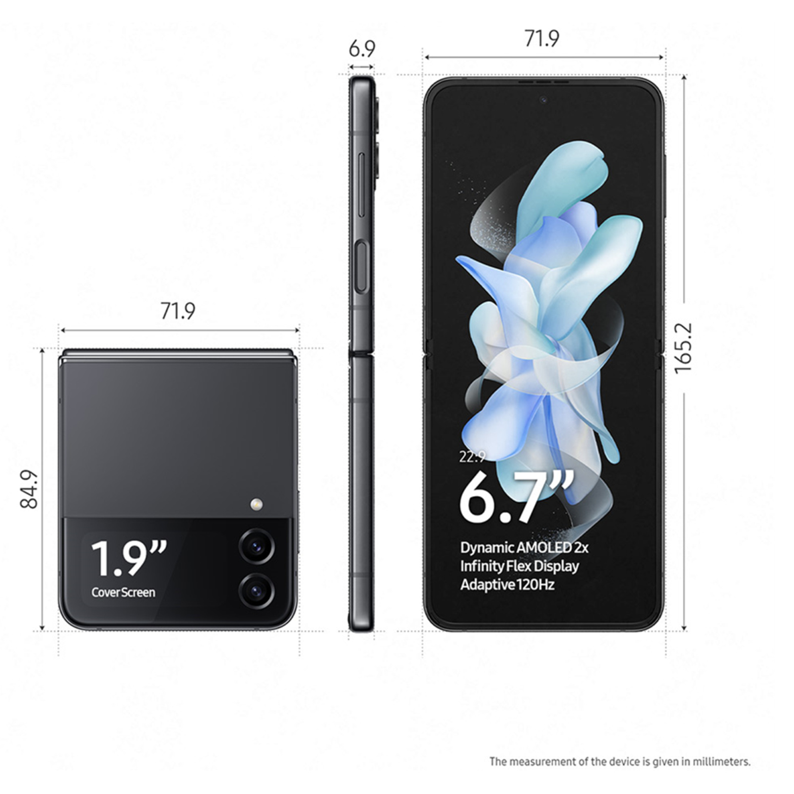 1. Measures 165.2 x 71.9 x 6.9 mm when unfolded and 84.9 x 71.9 x 15.9 ~ 17.1 mm when folded.