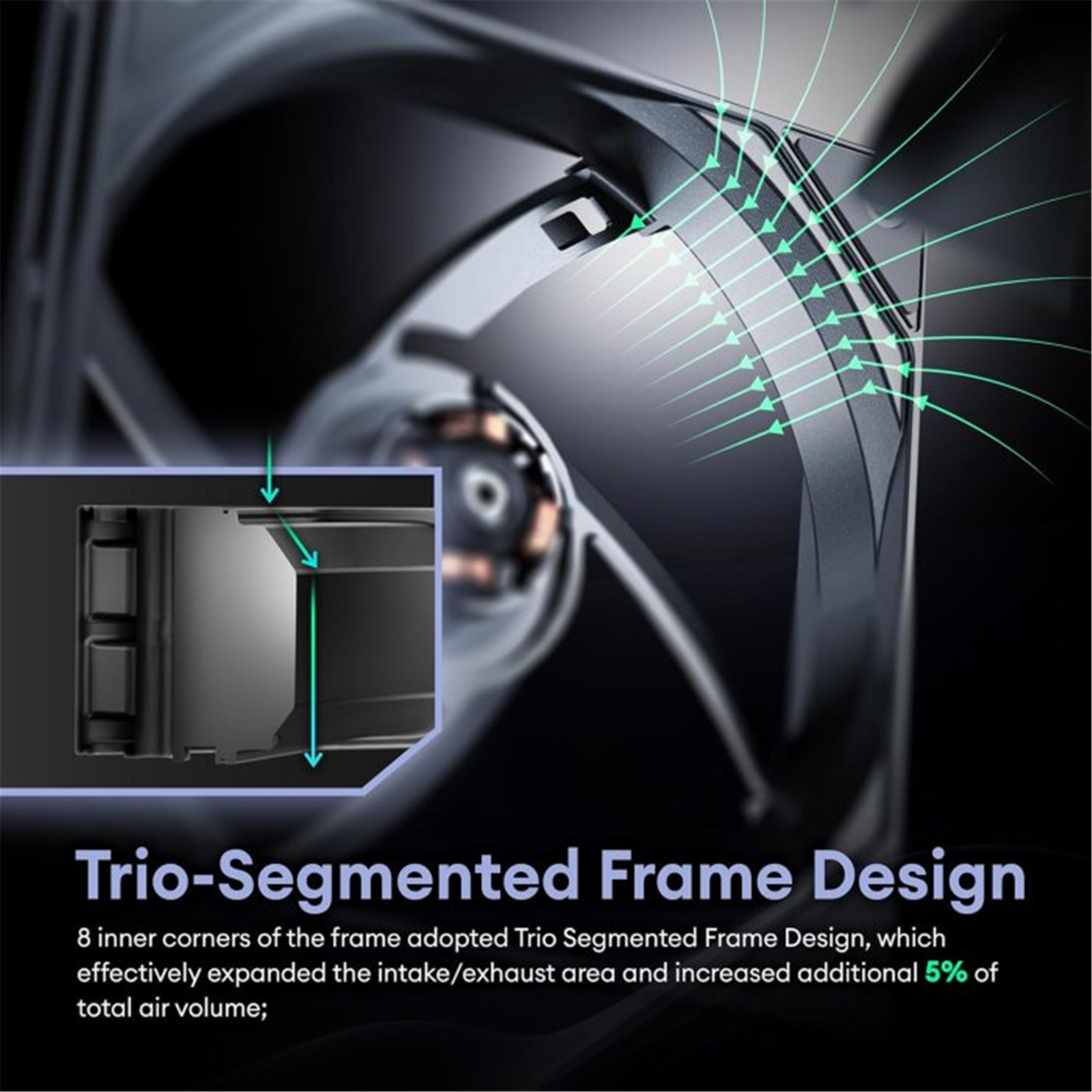 The trio-segmented frame design and advance pillar frame provide stability and prevent potential rattle noise. Additionally, the reinforcement bar design and anti-shock pads reduce vibration and noise levels, keeping the fans operating quietly at 27.5 dB(A).