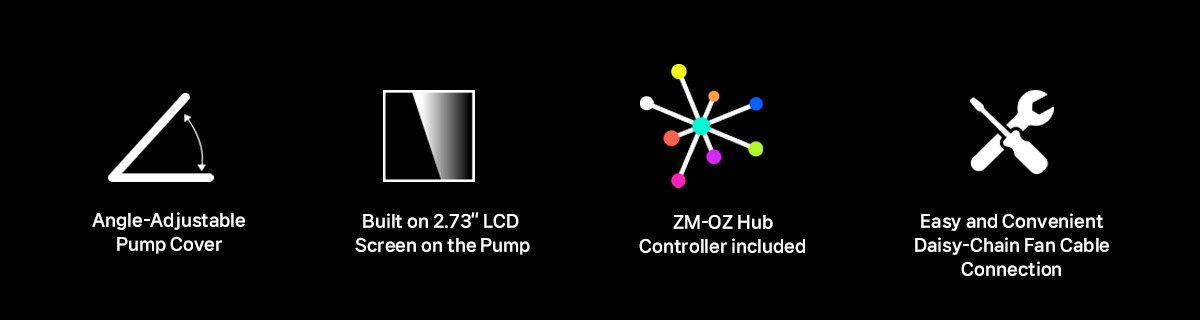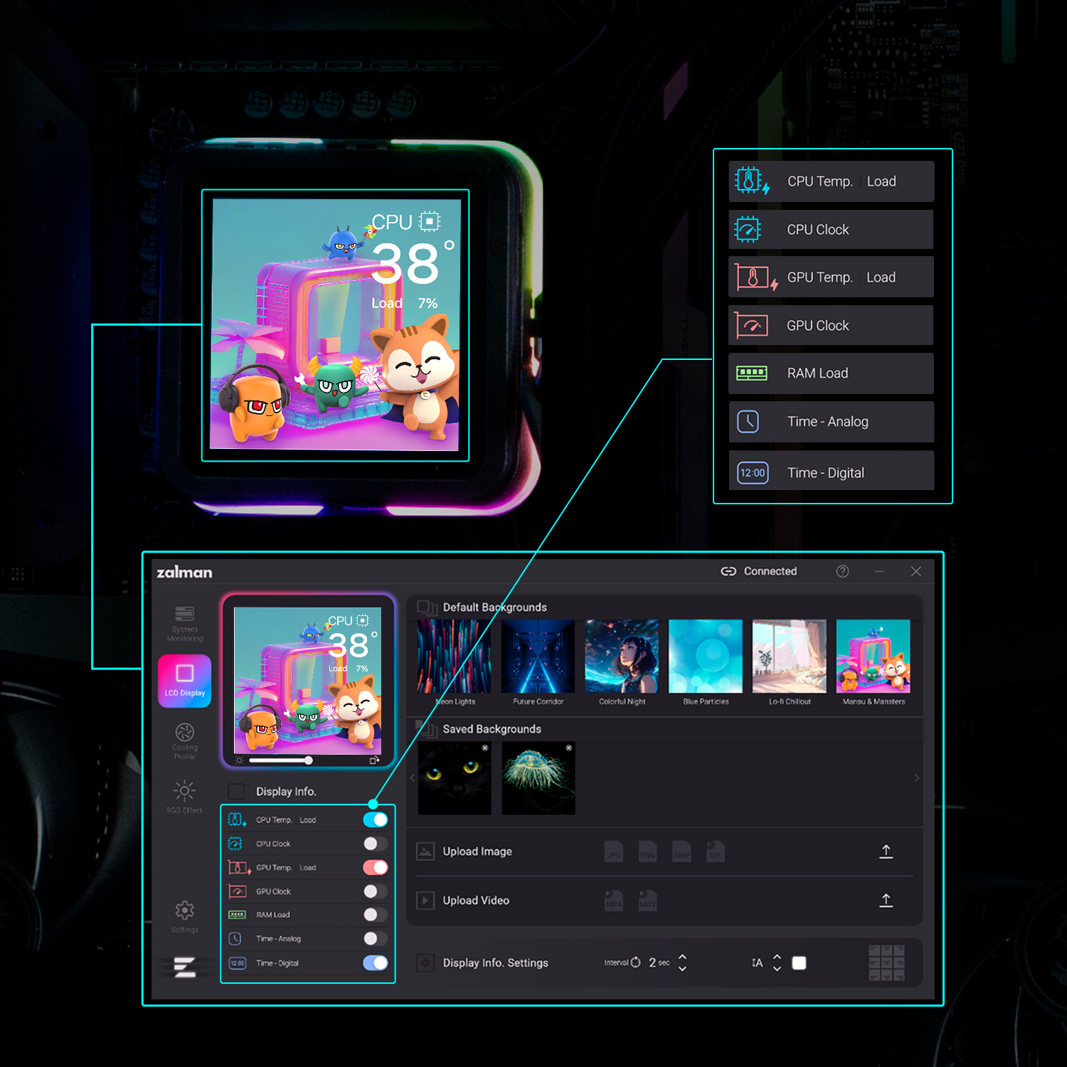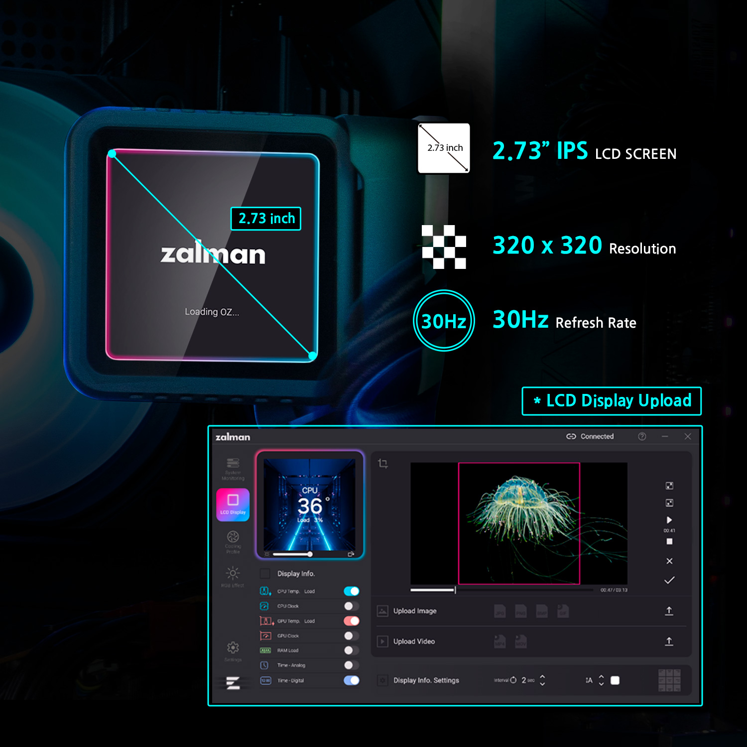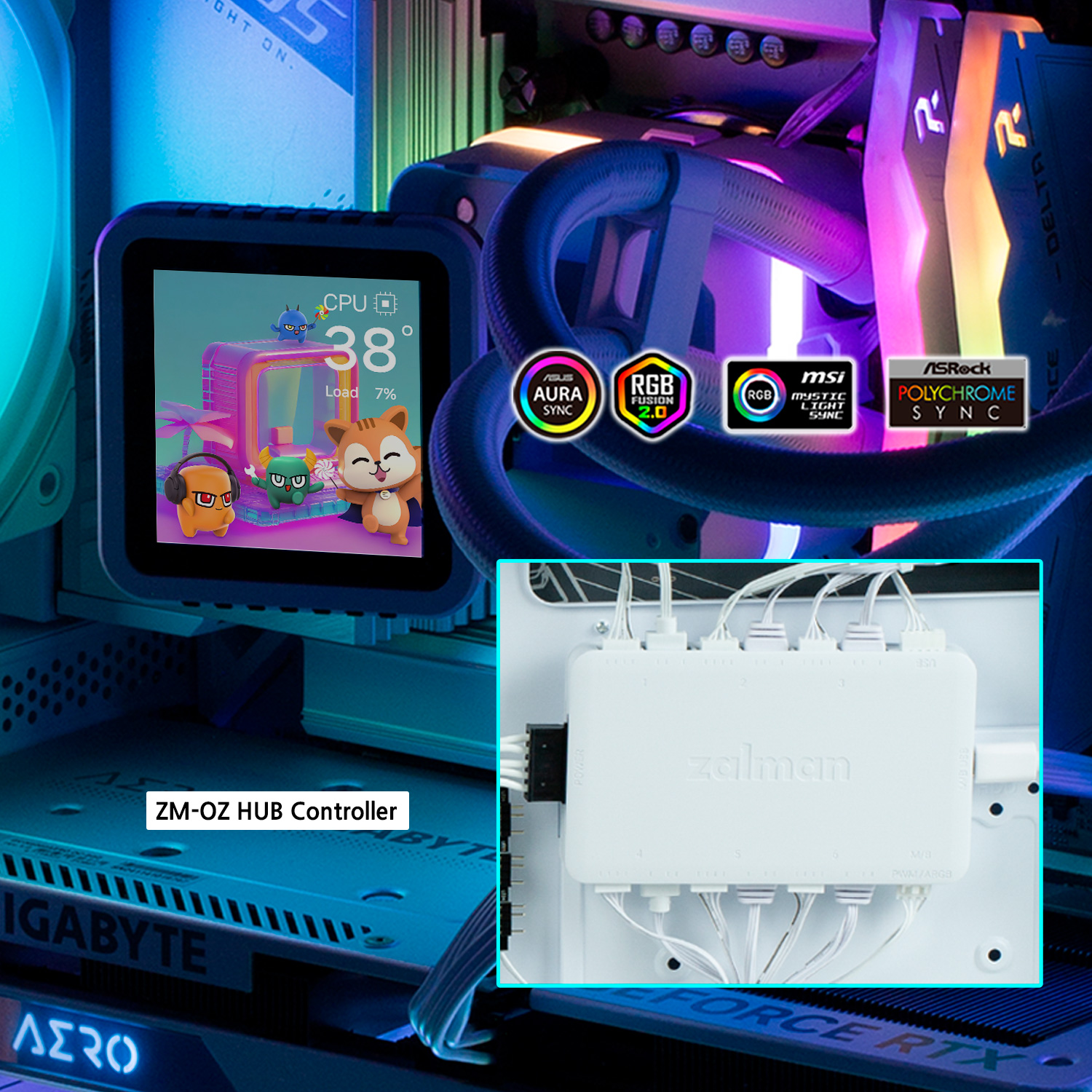 Customize various themes using an intuitive visual editing interface. ZM-OZ software supports up to 7 'Display inform'. Keep an eye on CPU temp, GPU clock, Ram load and more all at a glance.