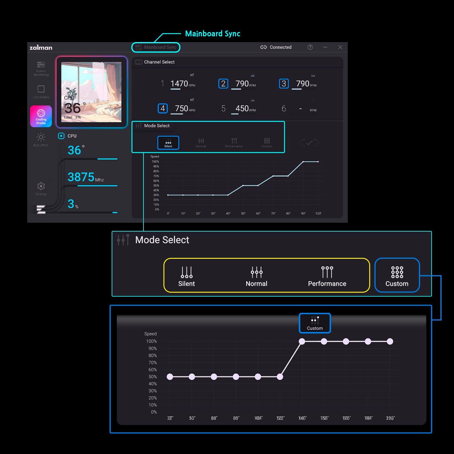 Up to 4 Fan control modes support. (Silent / Normal / Performance / Custom)