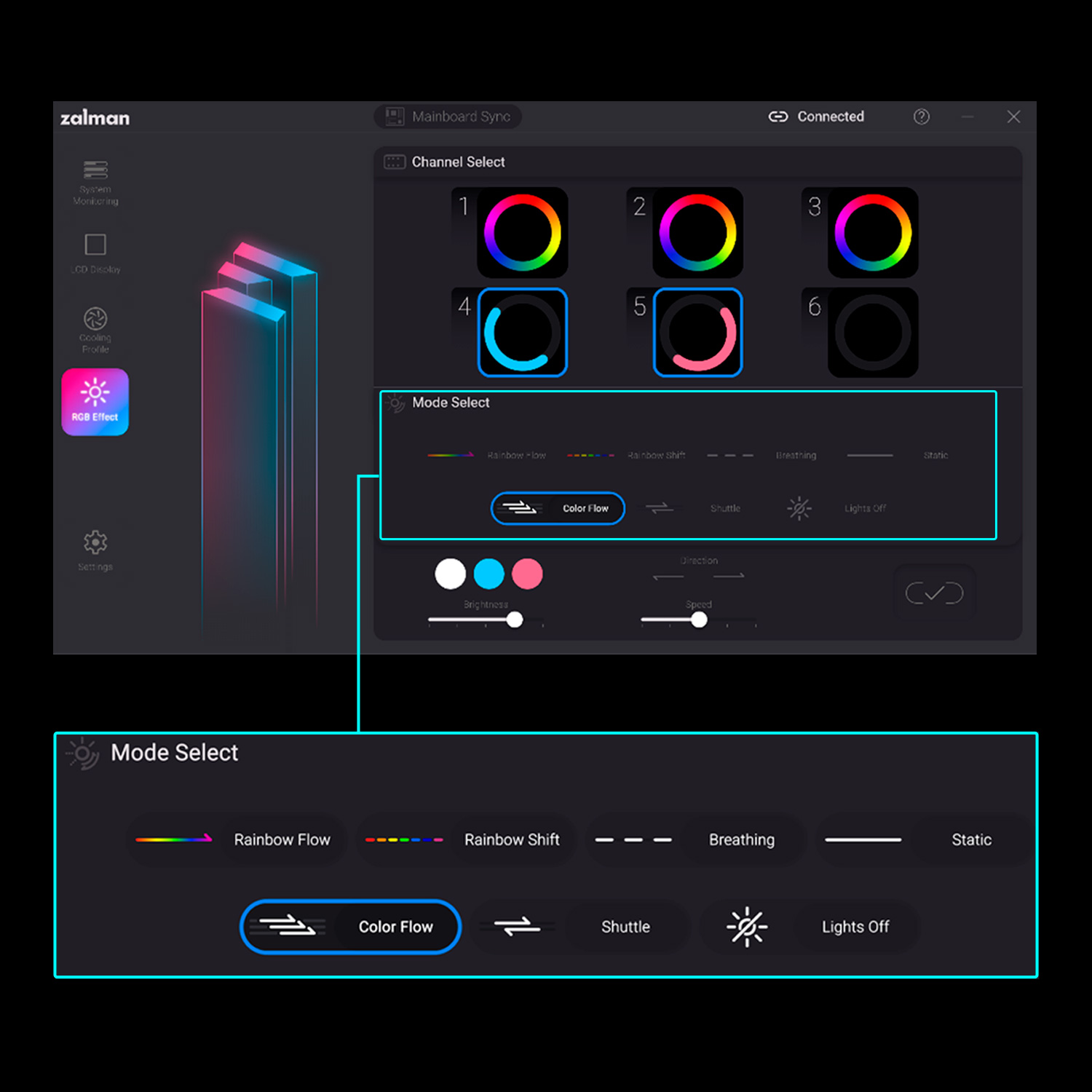 The ARGB Channel, Mode select for light effects and it matches the cooler and case more perfectly. Up to 7 modes of light effects with ARGB support, color can be managed and synchronized through the ZM-OZ software.