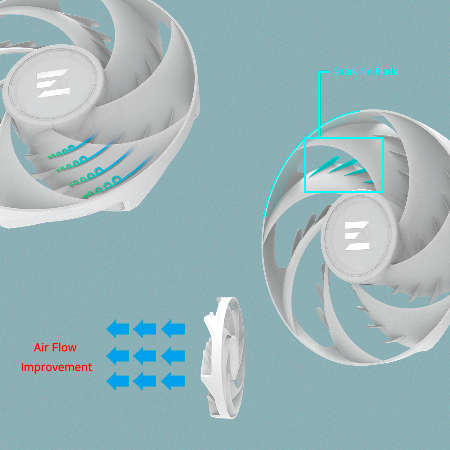 Unlike regular cooling fan, specially designed Zalman AF120 Annular FAN with Shark fin blade provides minimum resistance to airflow allowing minimum operation noise.