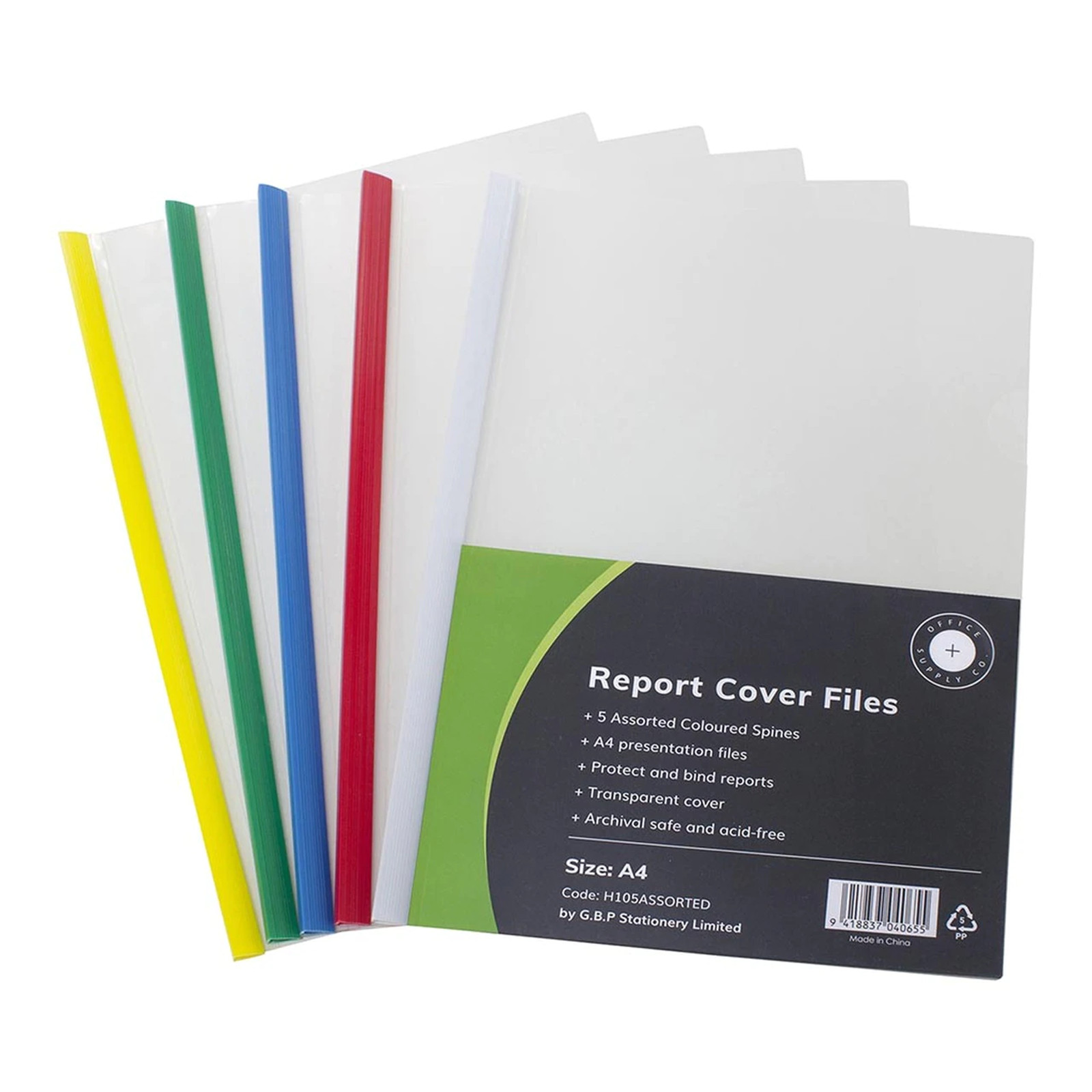 Office Supply Co Report Covers offer a simple and easy way to bind and protect your reports, documents and presentations. Features a transparent cover to show the front page of your presentation. Holds up to 50 sheets. Cover made from non-toxic, odourless and recyclable polypropylene. Clear covers with assorted colour spines. A4 size. Pack of 5.Specifications