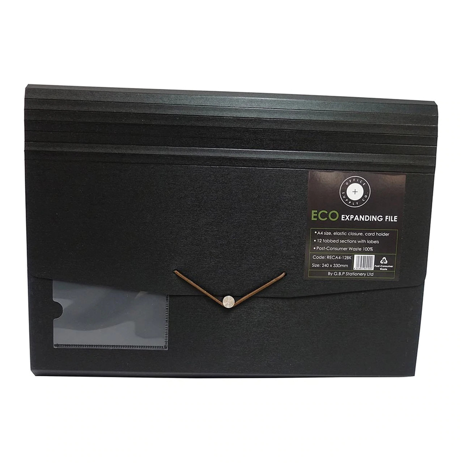 The Office Supply Co Expanding File is made from 100 percent Post Consumer Waste and has 12 pockets. It holds A4 paper and holds secure with an elastic closure.Specifications