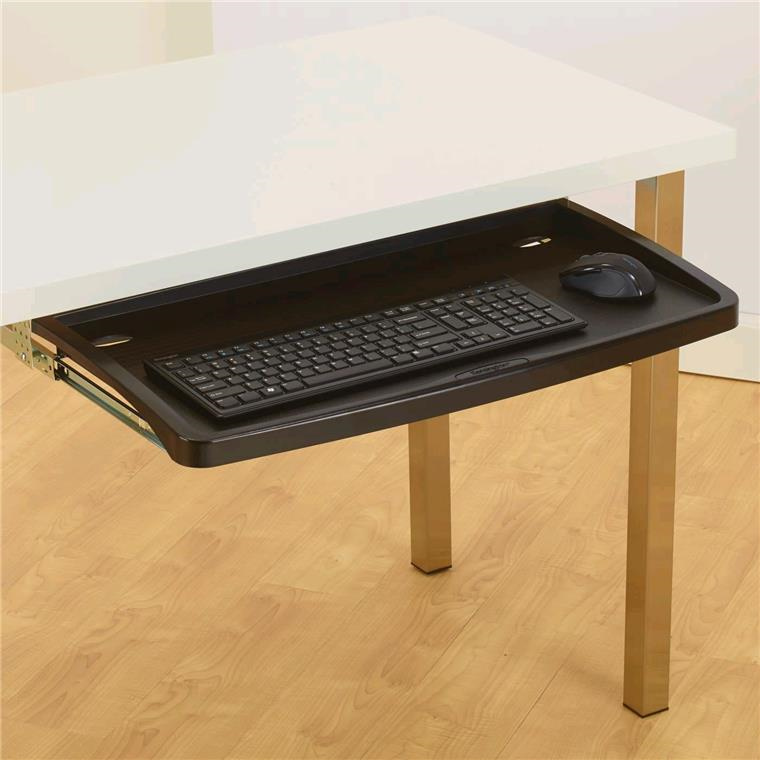 Sliding drawer has ample room for keyboard with wrist rest and a mouse with mouse pad, and can be installed at 1 of 3 height levels. Under-desk design maximizes desktop space and keeps keyboard neatly tucked away when not in use.
