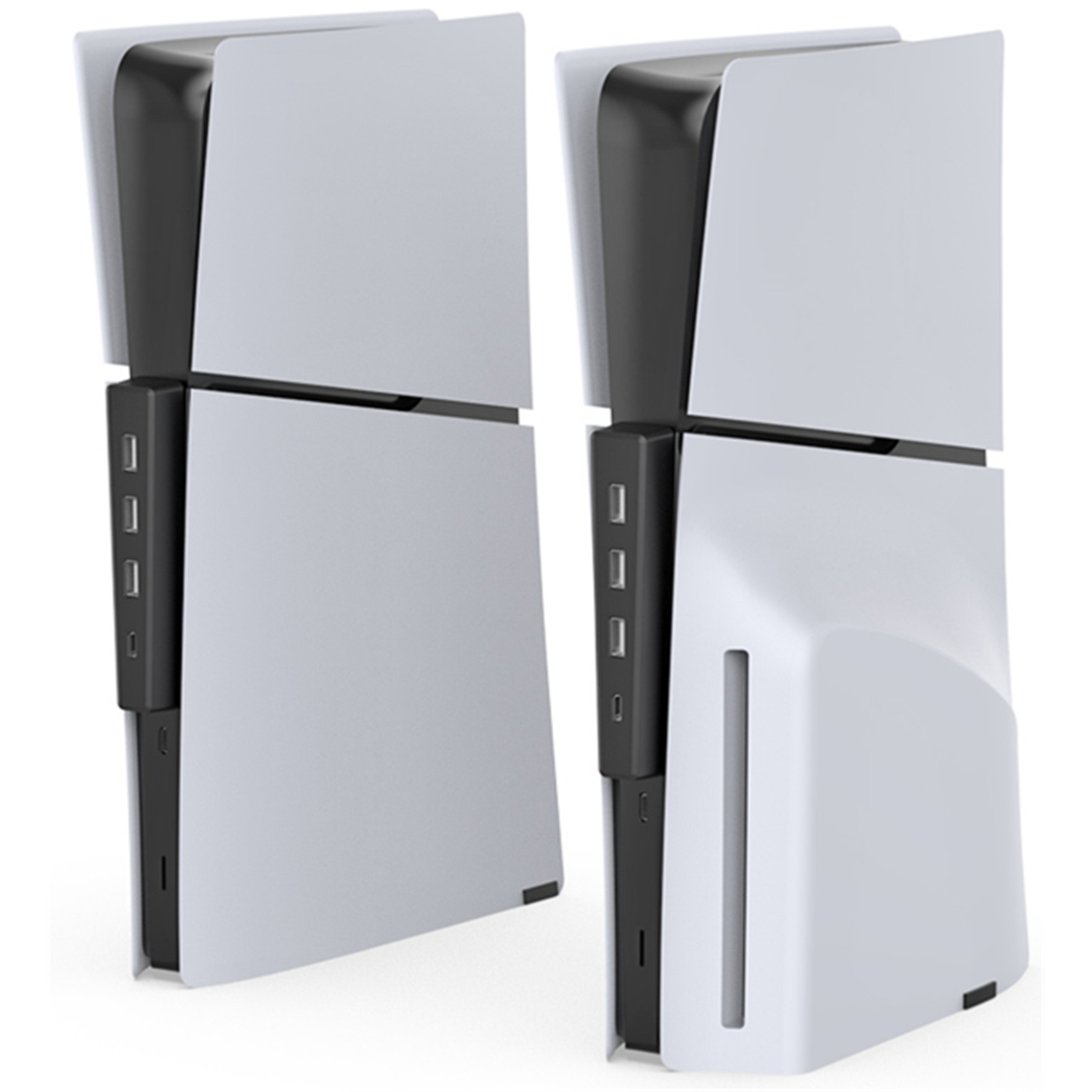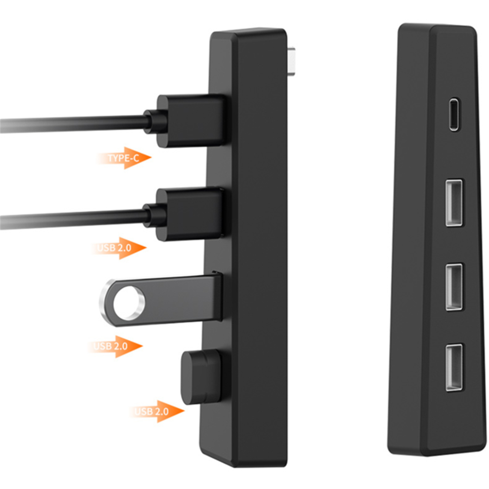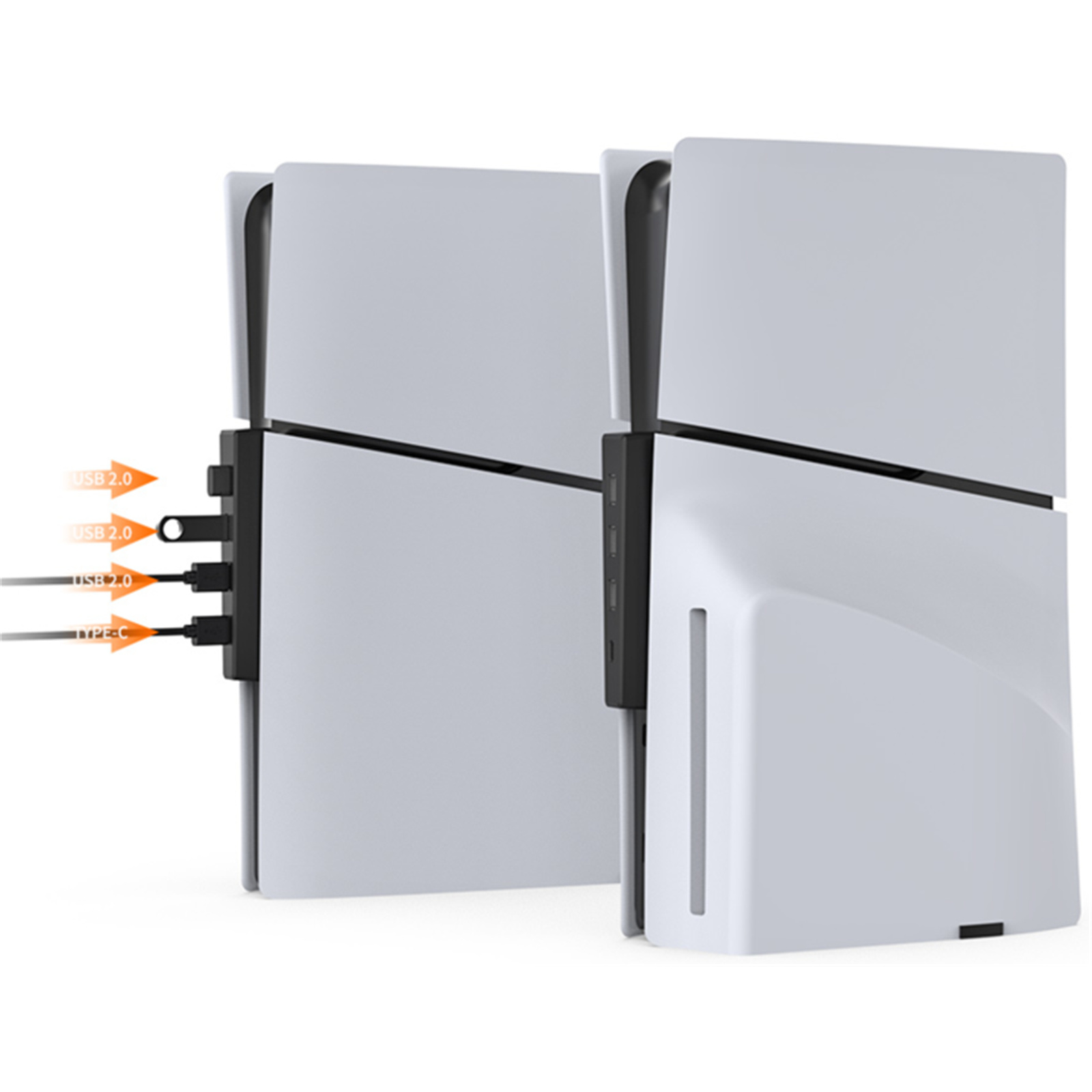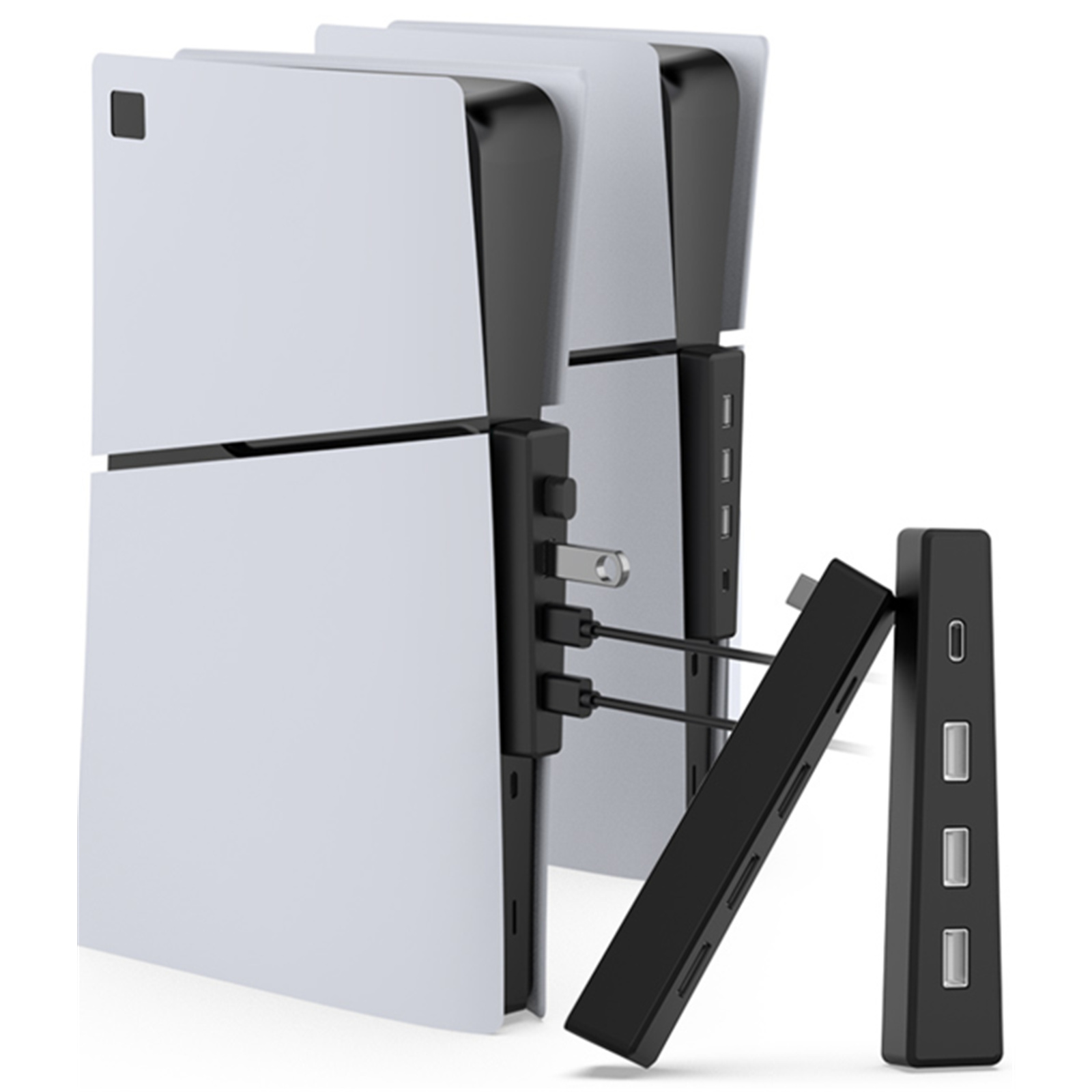 Compatible with PS5 Slim console Digital, DISC version and PS5 Pro, using USB2.0 data speed transmission HUB processor chips. Inserting the TYPE-C plug into the TYPE-C data transmission interface of the console can expand to one TYPF-C port and three USB2.0 data transmission interfaces. The product is lightweight and the exterior design is beautiful, also easy to use, which is a perfect fit to the console