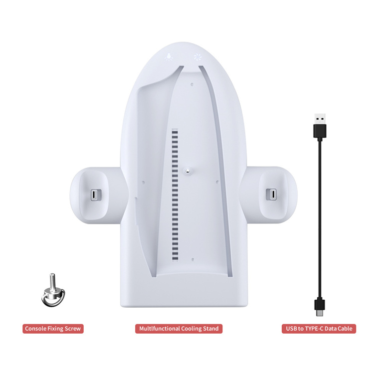 The Multifunctional RGB Charging Dock presents a spaceship-like aesthetic, tailored specifically for the PlayStation 5 Slim console. Its design not only complements the PS5 Slim's sleek appearance but also incorporates a built-in high-efficiency cooling fan. This fan features three adjustable gears - High, Middle, and Low - ensuring your console remains cool even during intense gaming sessions. The station smartly remembers your last used setting with its power-off memory function, providing a seamless gaming experience every time.