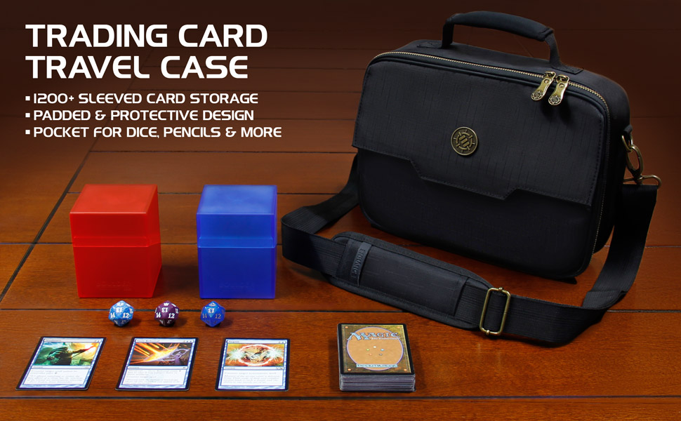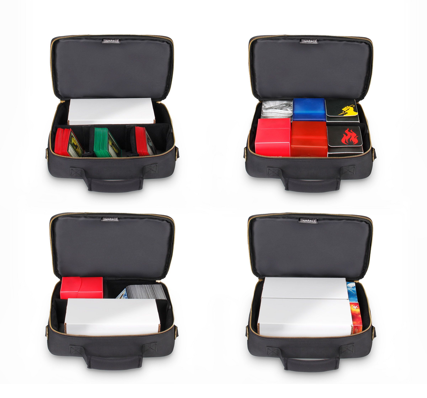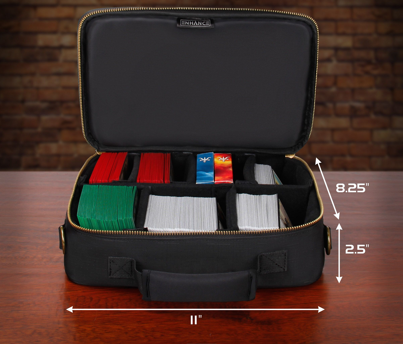 Compatible with MTG, Pokemon, Yugioh, CAH and More. Store and protect your favorite cards with the ENHANCE Tabletop series travel bag. A customizable interior with a scratch resistant lining allows you to create various sized compartments to store loose cards, commander deck cases, BCW storage boxes, and much more while keeping your collection in pristine condition.