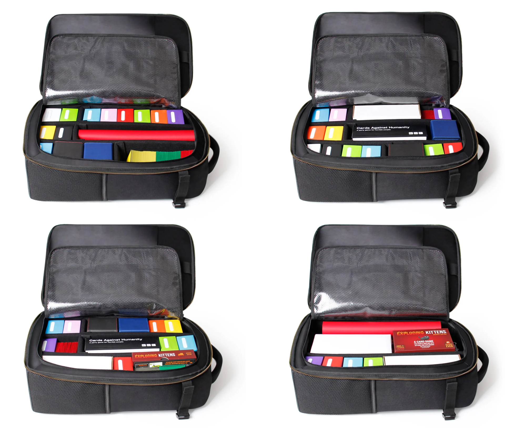 Convenient zippered divider keeps loose cards, decks and boxes within their compartments even when upside down or opened from a standing position.