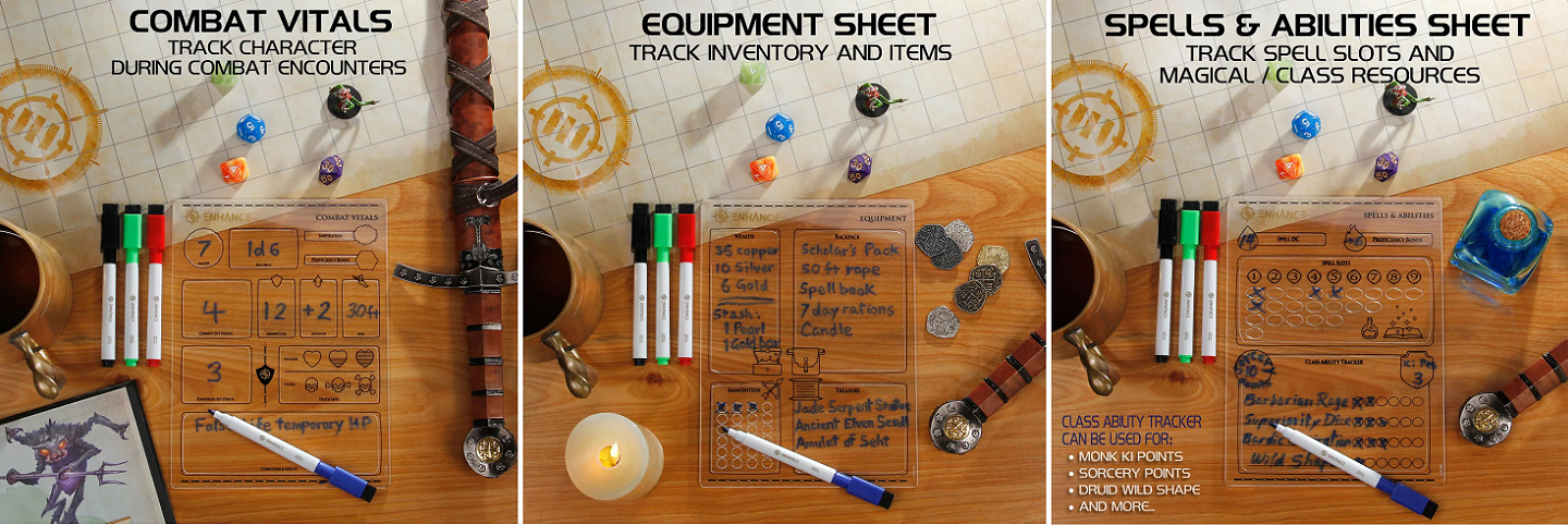 So were we! Introducing the ENHANCE Acrylic Character Sheets, designed to track the most dynamic stats/resources with dry erase markers on silk screened acrylic.