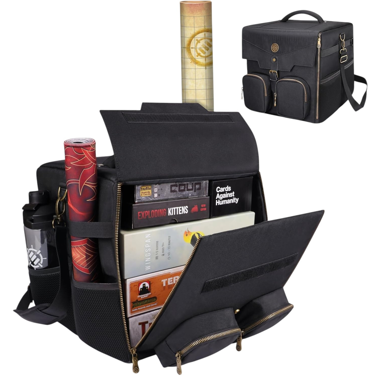 A collapsible gaming storage bag designed to hold your favorite board games makes it easy to store and travel with your games. The reinforced sides of the Game Box Shoulder Bag are made with a layer of padded foam lined with a polymer sheet that creates a semi-rigid shell for protecting your board games during travel.