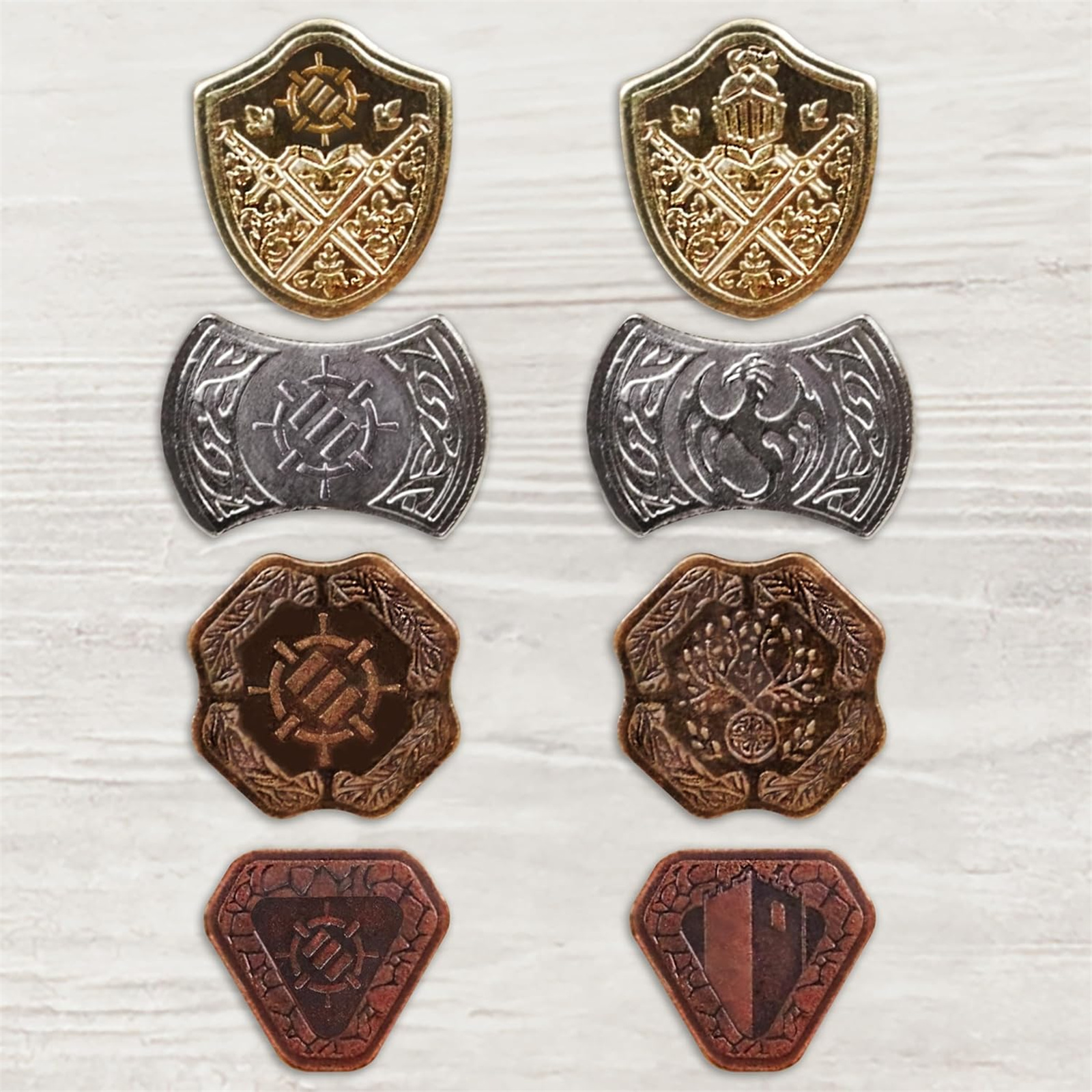 Treasure token set includes 10 of each metal token design: Castle/Fortress, Tree/Nature, Shield/Knight, and Dragon designs | Also included are 40+ gems of assorted shapes and colors.