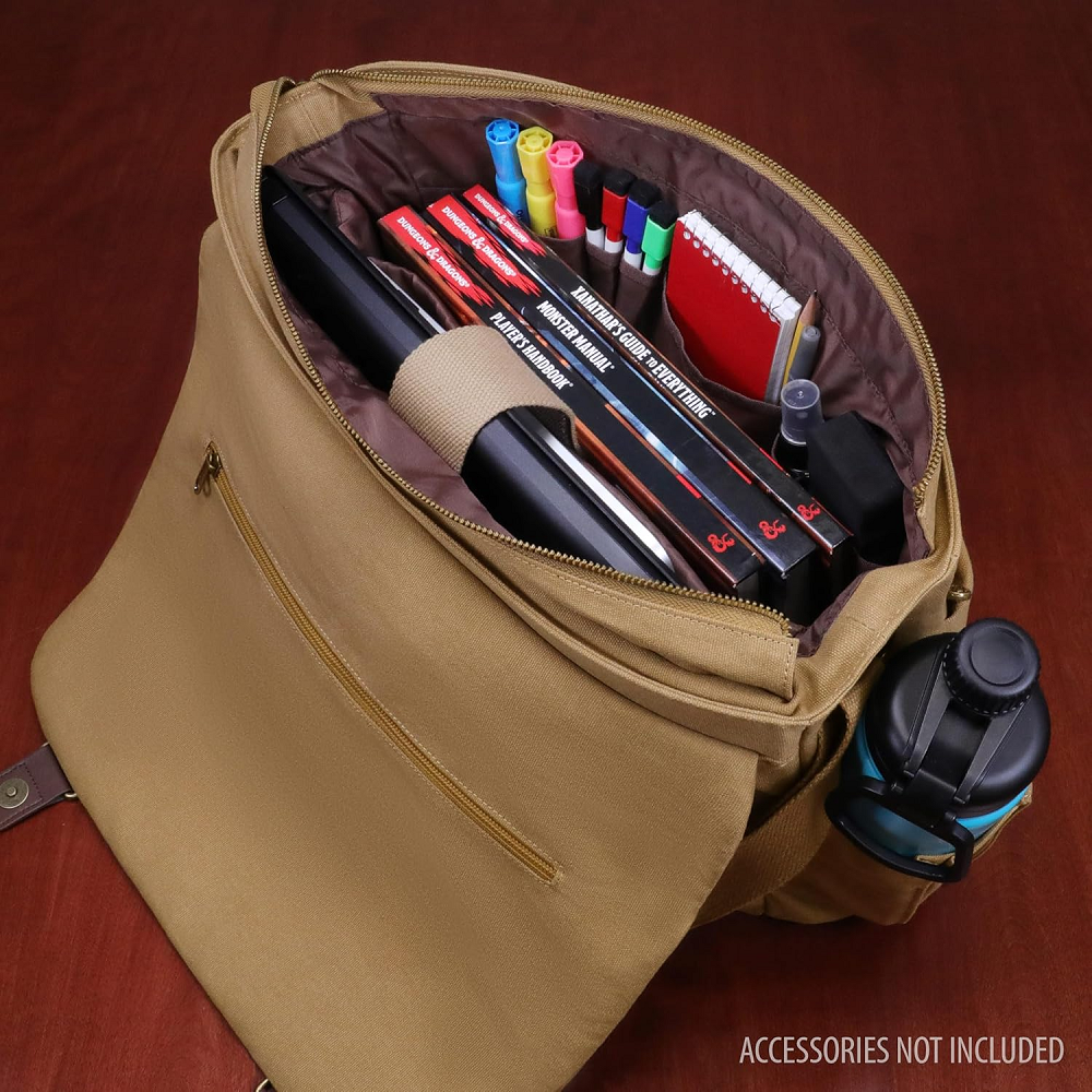 The messenger bag style design offers incredible versatility, comfort, and aesthetic. Take your canvas bag with you from the game night to the office. The interior features a thick padded divider to help organize your character's gear and includes enough space for up to 4 rulebooks, or a combination of binders, journals, folios, and more. Opposite the divider is a special compartment with an elastic security strap designed to hold laptops and tablets in place during travel.