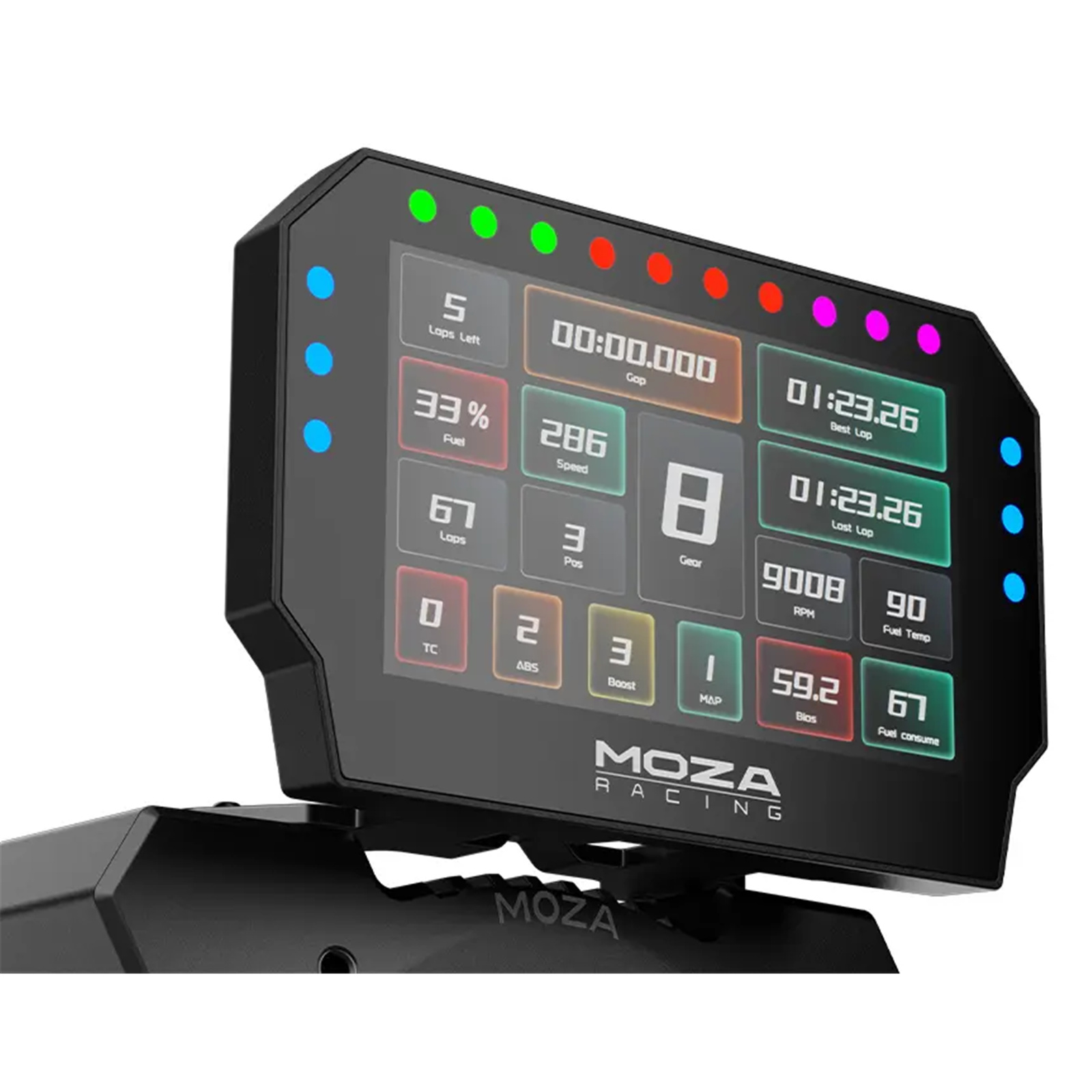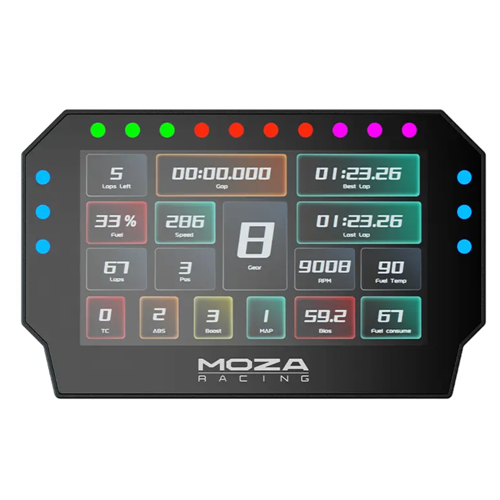 Take control with the MOZA CM2 HD Racing Dash. Equipped with a 5-inch 720P touchscreen, customizable UI, 10 RGB shift indicators, and 6 flag lights, this dashboard delivers real-time race data with precision. It's the perfect addition to your sim racing rig, powered by a quad-core processor and designed for both MOZA and third-party setups.