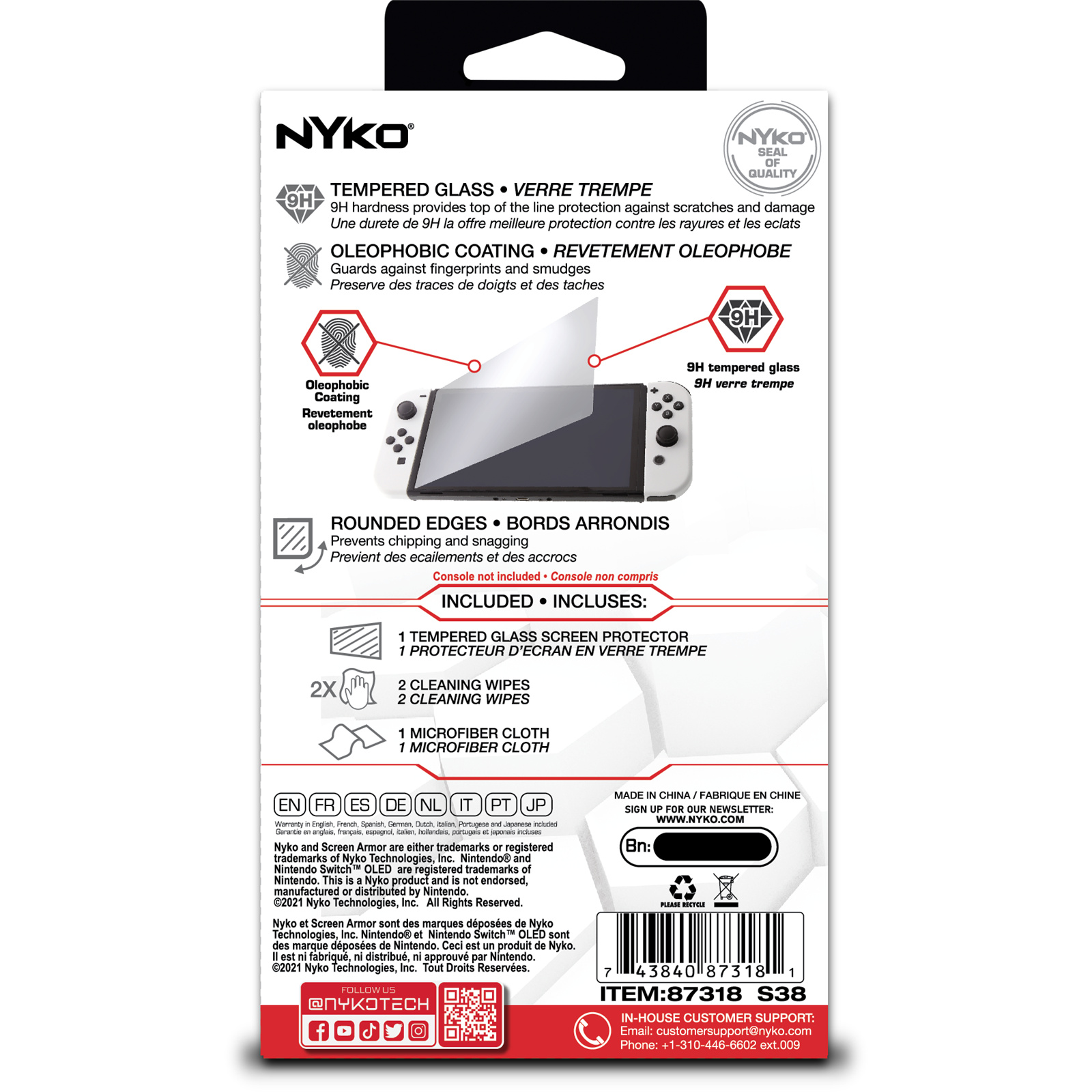 Protect the screen of the Nintendo Switch OLED™ with Screen Armor from Nyko. Screen Armor protects against scratches, chips, fingerprints and smudges. A 9H hardness rating tempered glass screen protector provides top of the line protection and the rounded edges prevent chipping and snagging. The Oleophobic coating helps guard the screen against everyday wear and tear. Screen Armor is thin enough to be applied and allow the console to be docked to enjoy TV Mode. Included in the package is a set of cleaning wipes to prepare the screen before applying Screen Armor.