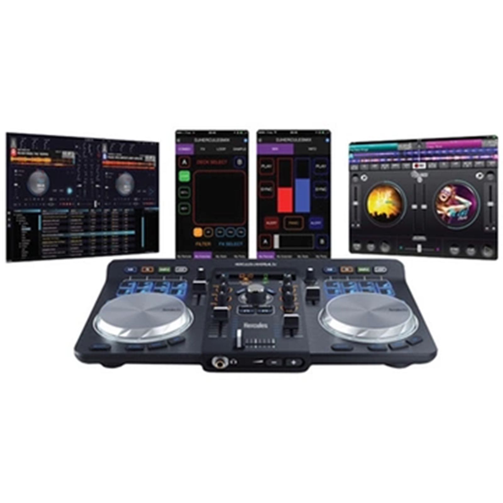 The Hercules Universal DJ Controller allows you to mix two separate decks with pressure-sensitive metal surface capacitive jog wheels, sixteen backlit trigger pads, and a built-in audio interface with speaker and headphone outputs on either your PC/Mac in LAPTOP Mode, using your smartphone or tablet via Bluetooth as an extension to your Mac or PC in MULTISCREEN mode, or directly from your tablet in TABLET mode.