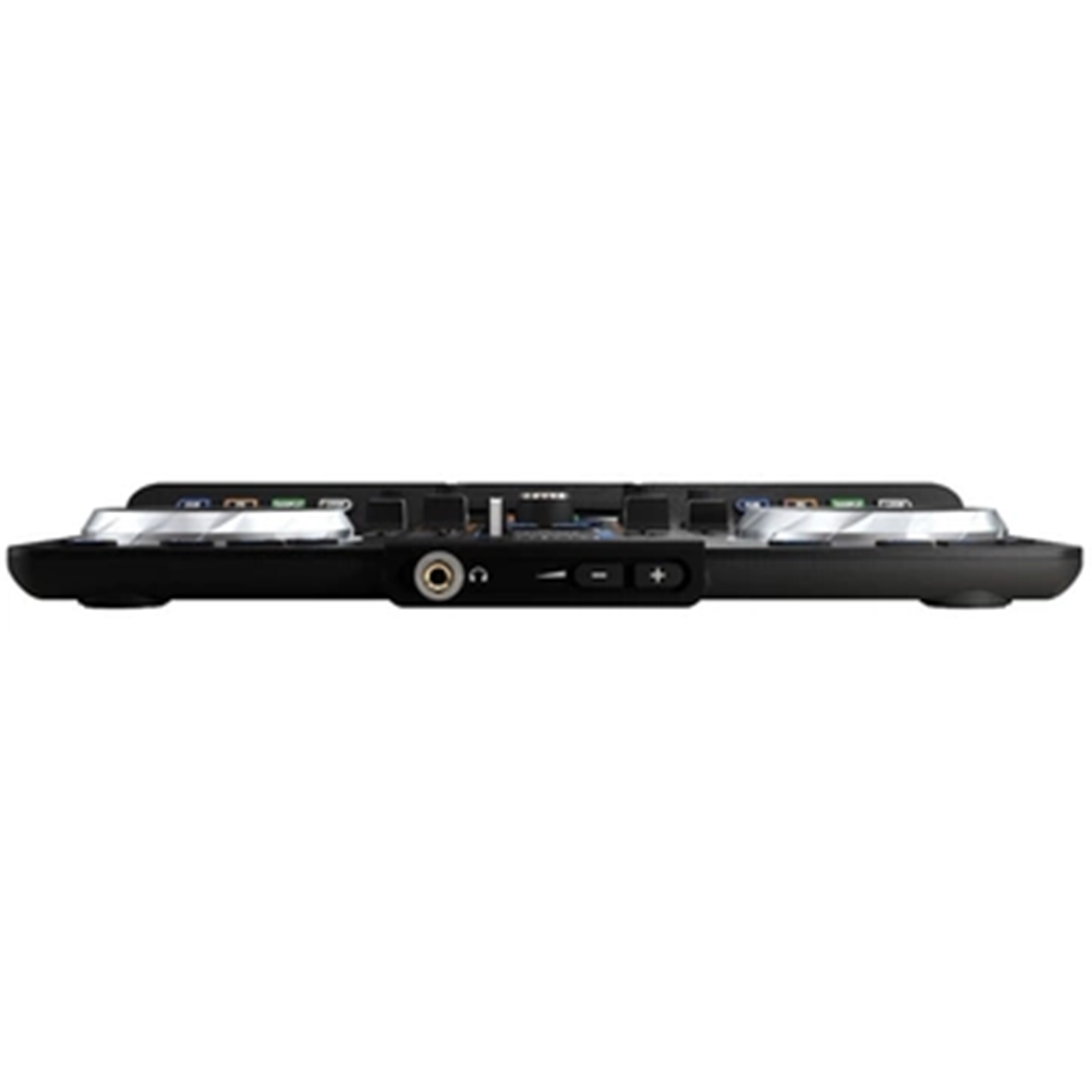 Each side of the controller features the scratch-brushed capacitive jogwheel, a set of transport controls for play/cue/sync, a pitch fader, and eight backlit pads that can operate in four different modes. The centre section features a volume fader for each side, a crossfader for cutting between tracks, a 3-band AEQ for each side, and a browse encoder button for selecting tracks from your media library. The front of the device features a 1/4" headphone output with volume adjustment buttons and the back of the unit includes a pair of RCA connectors for use with a PA system.