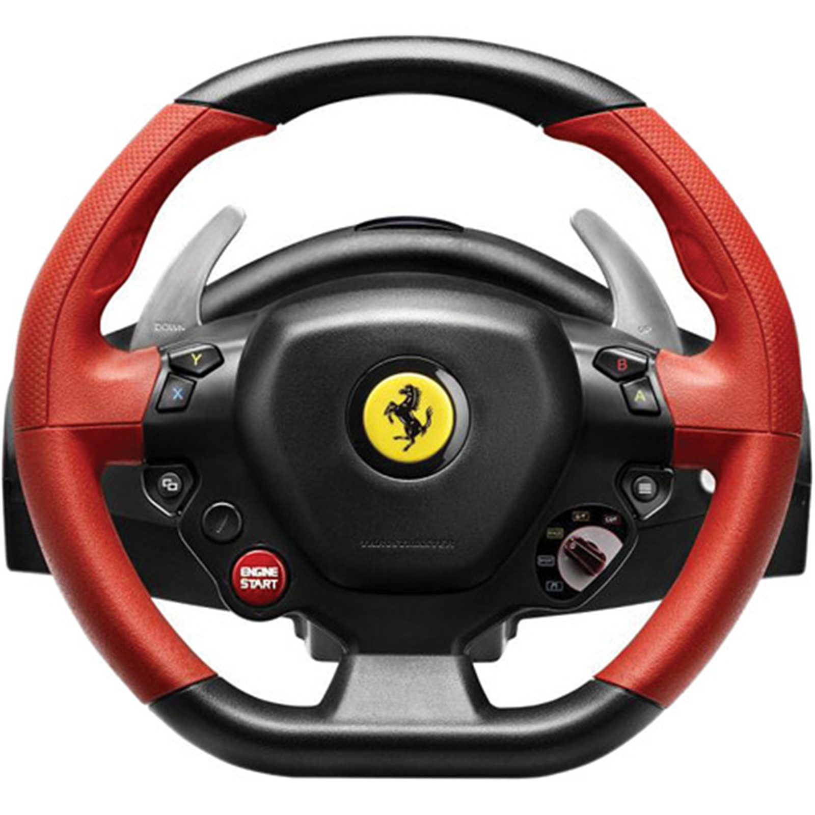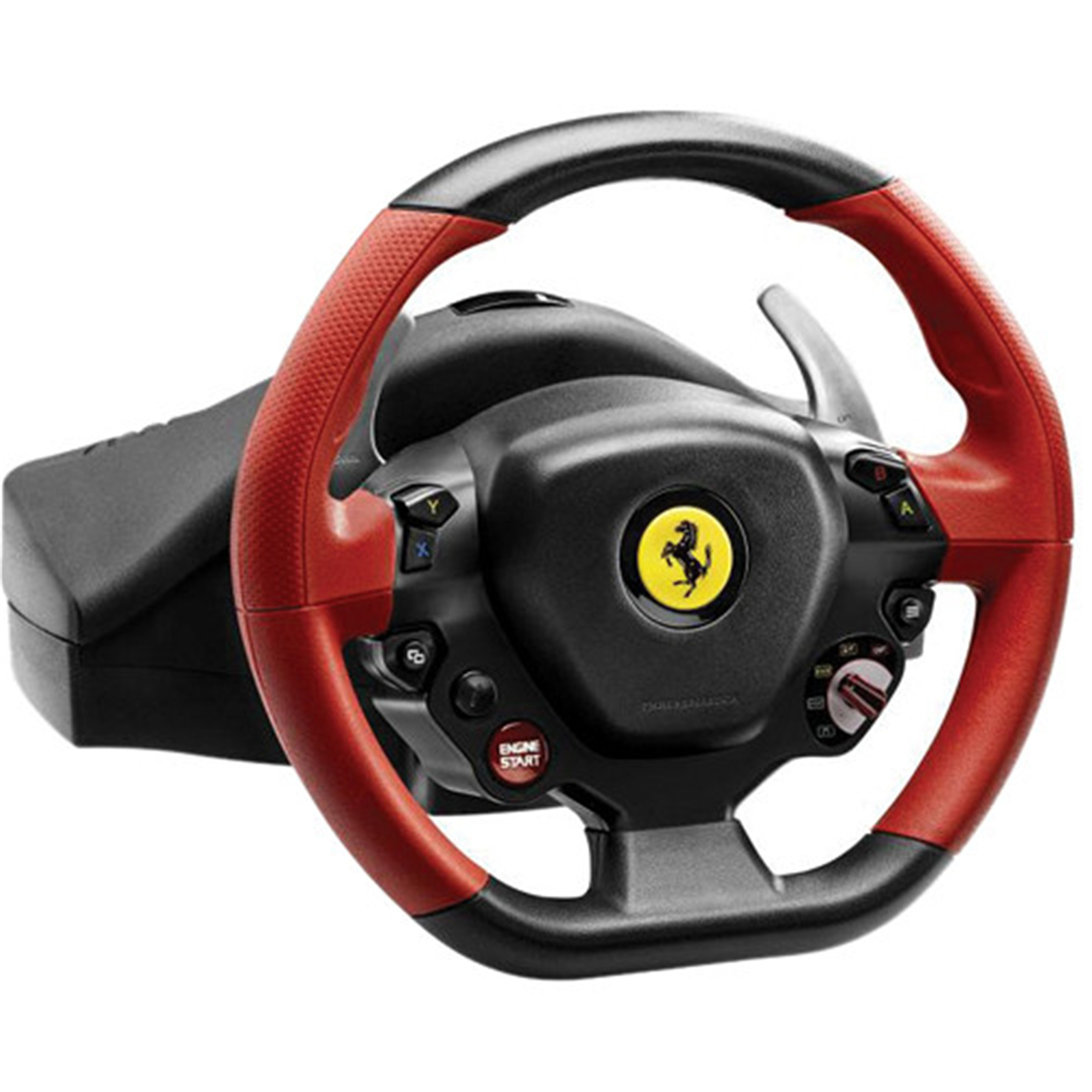 The Thrustmaster Ferrari 458 Spider Racing Wheel is a gaming wheel for use with the Xbox One. It's officially licensed by Ferrari and Microsoft Xbox One, and is a 7/10 replica of the Ferrari 458 Spider racing wheel. The wheel is equipped with two red rubber-textured grips and metal paddle shifters. Its sensitivity can be adjusted for precise driving. There are also nine replica action buttons, a Manettino, an ENGINE START D-Pad, and an Xbox Guide button. The wheel and pedal set was inspired by motor sports to ensure ergonomic comfort. The pedal set features two individually adjustable pedals with a wide foot rest, and the brake pedal features progressive resistance. A central clamping system ensures stability on all desks or tables.