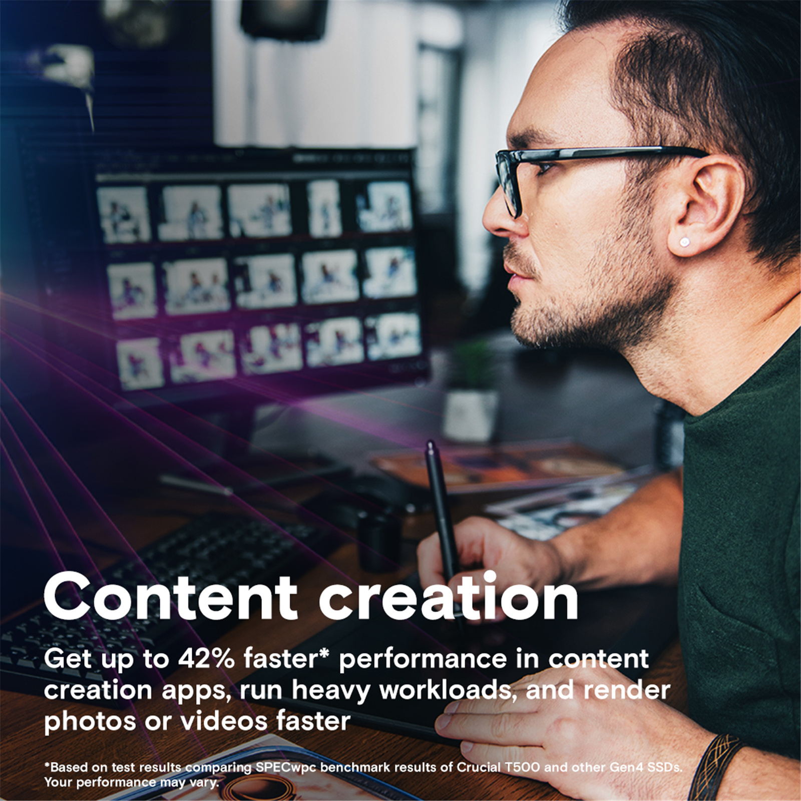 Fuel your system performance with the Crucial® T500 Gen4 NVMe® SSD. Experience faster gaming and amp up your creative potential with an SSD that moves as fast as you need it to. Heavy tasks are no problem with better performance to power efficiency, and the T500 works with your laptop or desktop.
