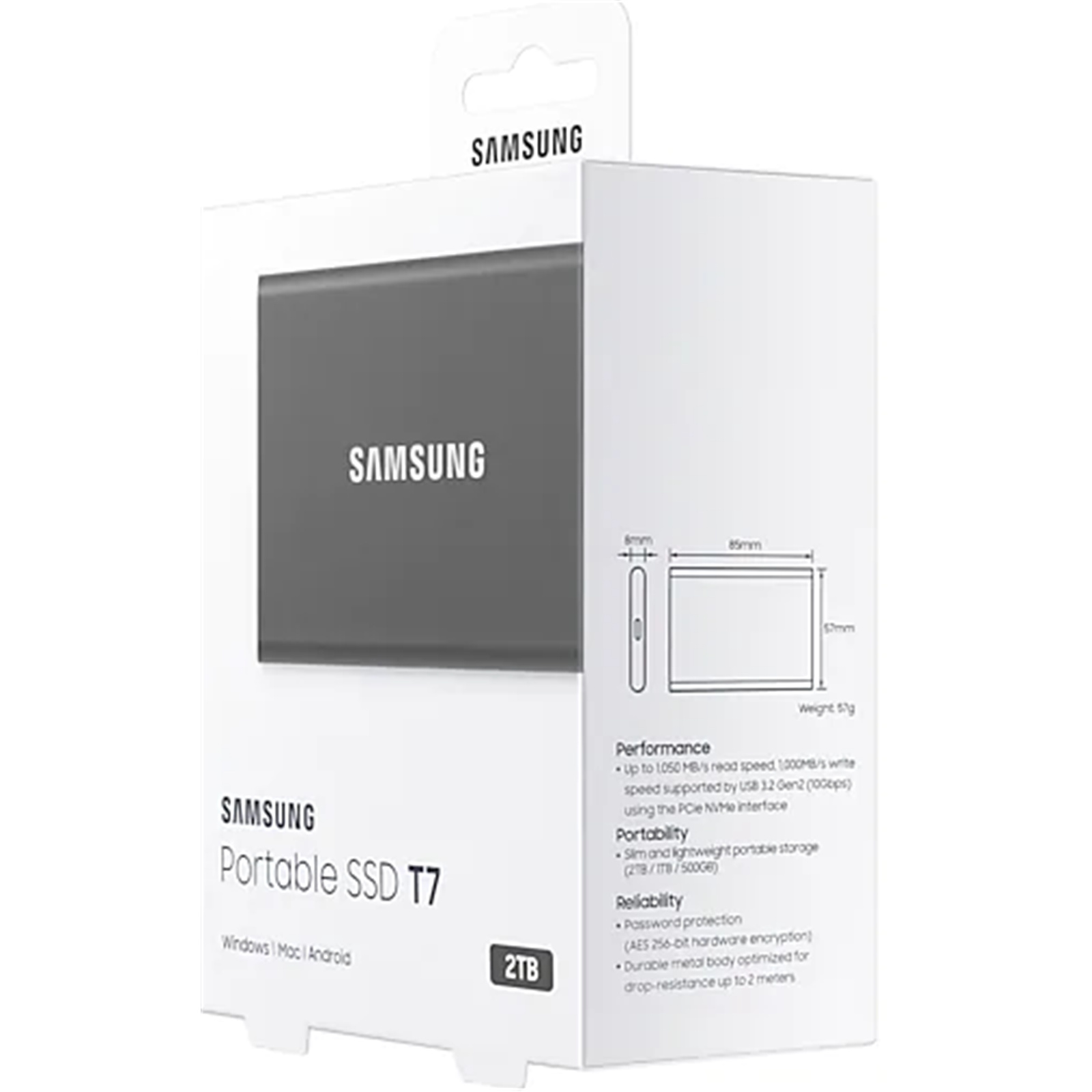 Pocket-sized and slim, the lightweight body comes standard on the T7. Roughly the size of a credit card and weighing in at 58 grams, the solid aluminum unibody construction fits comfortably in the palm of your hand.
