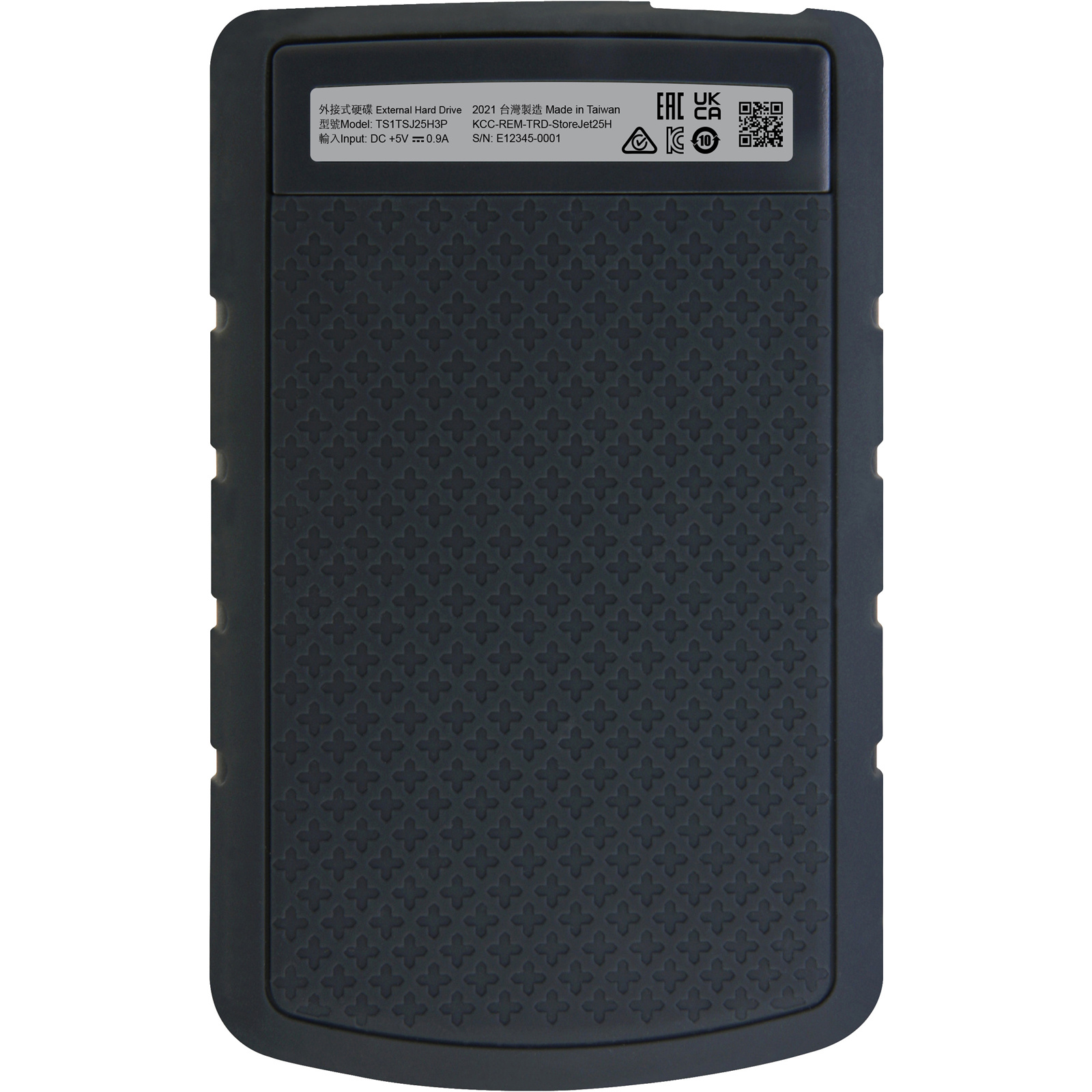 The StoreJet 25H3 features a three-stage shock protection system that has passed MIL-STD-810G US military transit drop test to fully protect data stored on the drive. The three-stage shock protection system includes a silicone rubber case, an internal shock-absorbing suspension damper, and a reinforced hard casing.