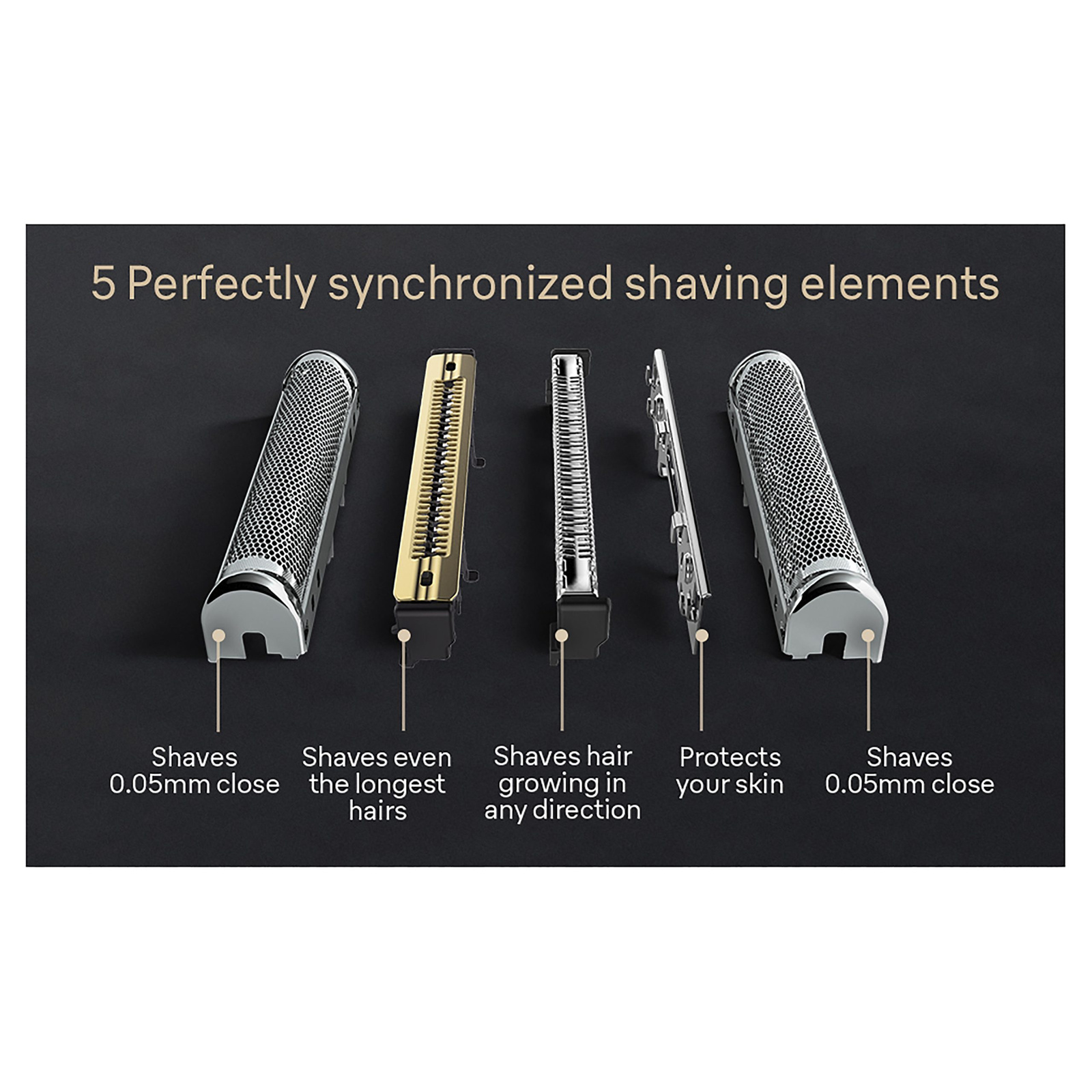 - No matter 1, 3, or 7-day beard: 5 perfectly synchronized shaving elements deliver exceptional efficiency and skin comfort, even on the longest & trickiest hair in every stroke.