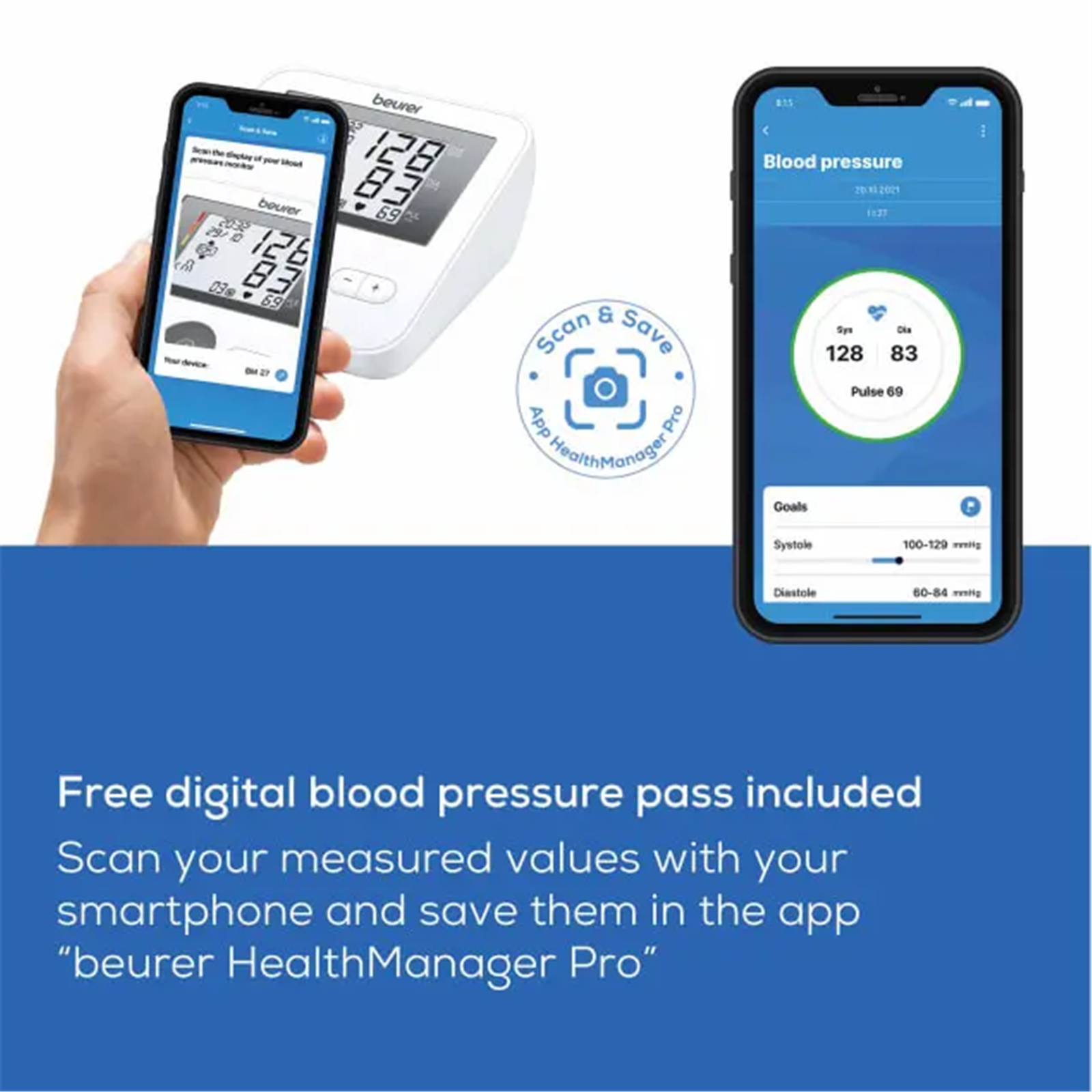 Writing down your blood pressure values is a thing of the past! Thanks to the "Scan & Save" function, you can now save measurements from all Beurer blood pressure monitors digitally in the app - even without Bluetooth®. All you need to do is scan the measurements with a smartphone camera. The result is automatically detected and saved in the app "beurer HealthManager Pro".