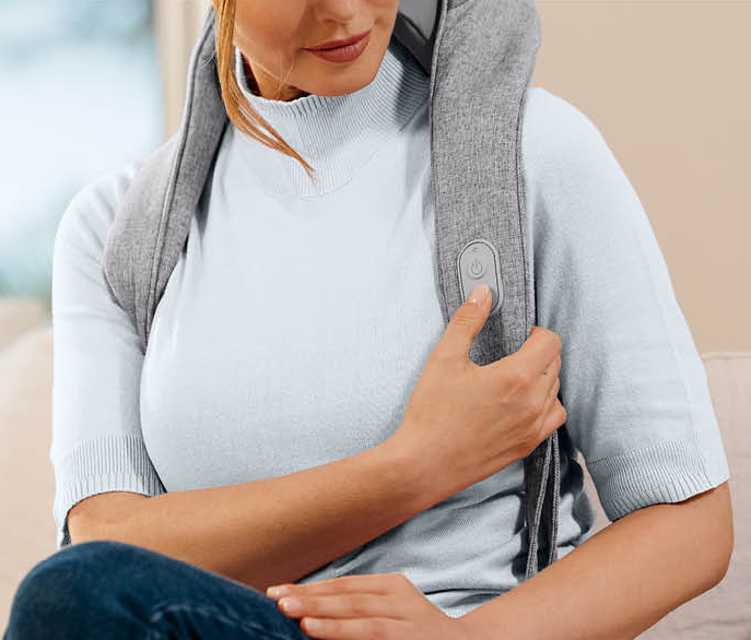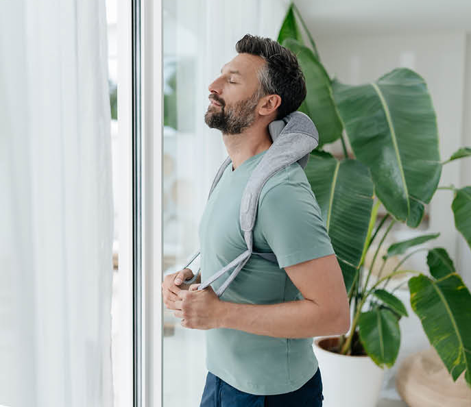 The massager is placed around the neck and fastened to the back with a buckle. This rucksack system allows you to enjoy wellness massages without sacrificing freedom of movement. For example, you can use it in your home office or on other errands.
